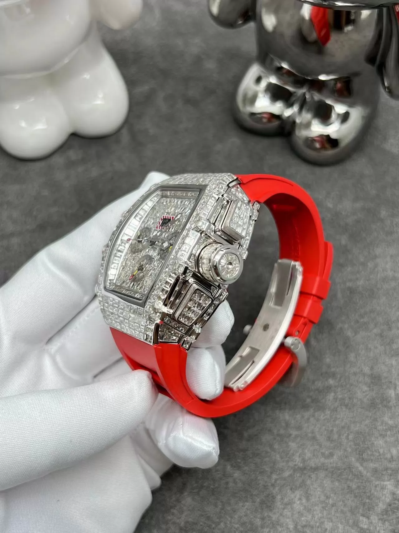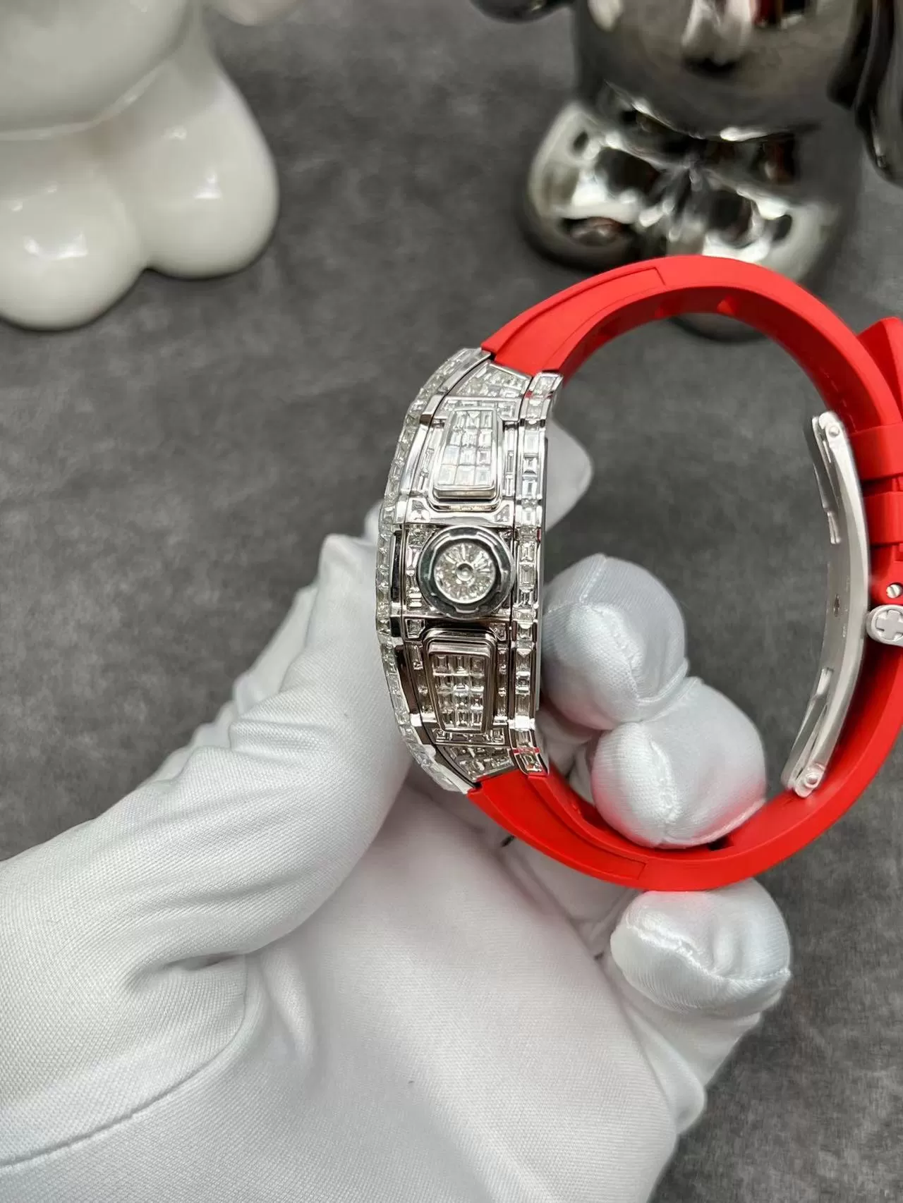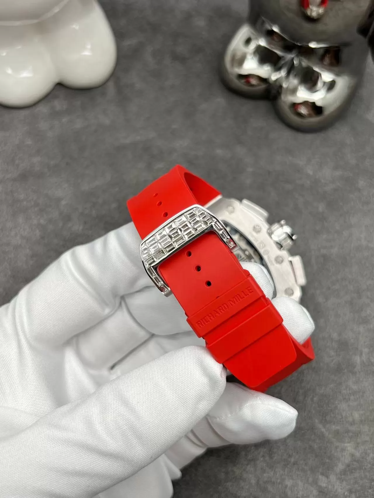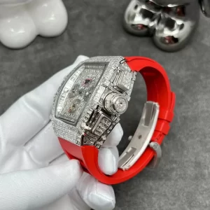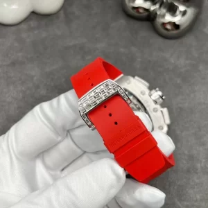 Nhờ bộ khung vỏ được làm bằng thép không rỉ với những chi tiết chạm khắc tinh xảo, gắn những viên đá sáng lấp lánh như kim cương thật khiến chiếc Đồng Hồ Richard Mille RM011 Full Kim Cương toát lên vẻ sang trọng, quý phái không lẫn với bất cứ thiết kế nào. Kết hợp với dây đeo màu đỏ cá tính, sáng tạo khiến tổng thể chiếc đồng hồ vô cùng nổi bật và hấp dẫn.