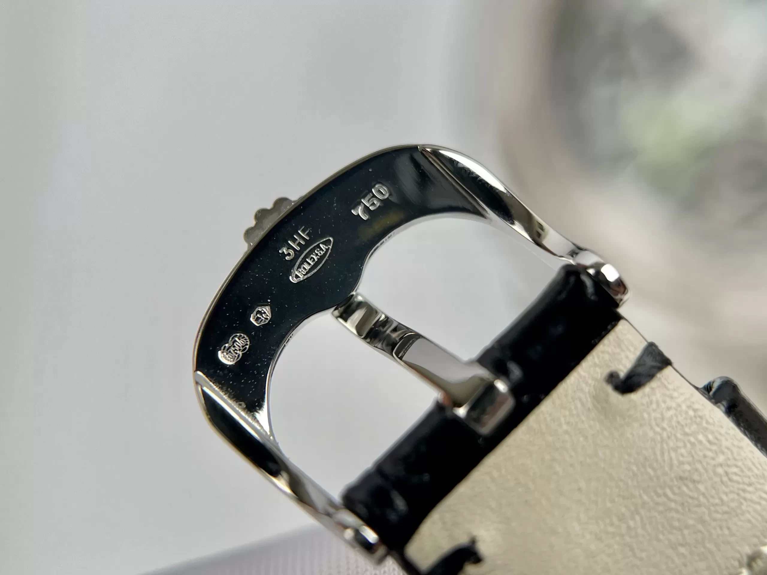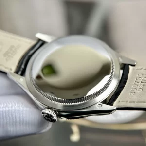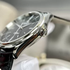 Dây đeo da cá sấu đen cao cấp, may tay chắc chắn ôm sát cổ tay mà không gây khó chịu. Khóa gập vàng trắng 18K an toàn dễ thao tác, mang lại sự thoải mái lâu dài cho người đeo năng động.