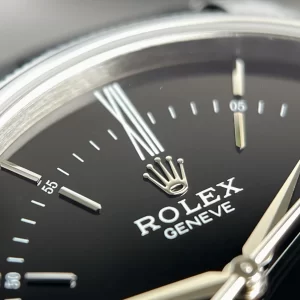 Mặt số đen lacquered bóng bẩy với cọc số Roman dạ quang dễ đọc, hỗ trợ theo dõi giờ phút rõ ràng dưới mọi điều kiện ánh sáng. Thiết kế tối giản nhấn mạnh kim giờ mảnh mai, tăng tính thẩm mỹ cổ điển mà vẫn thực tiễn.