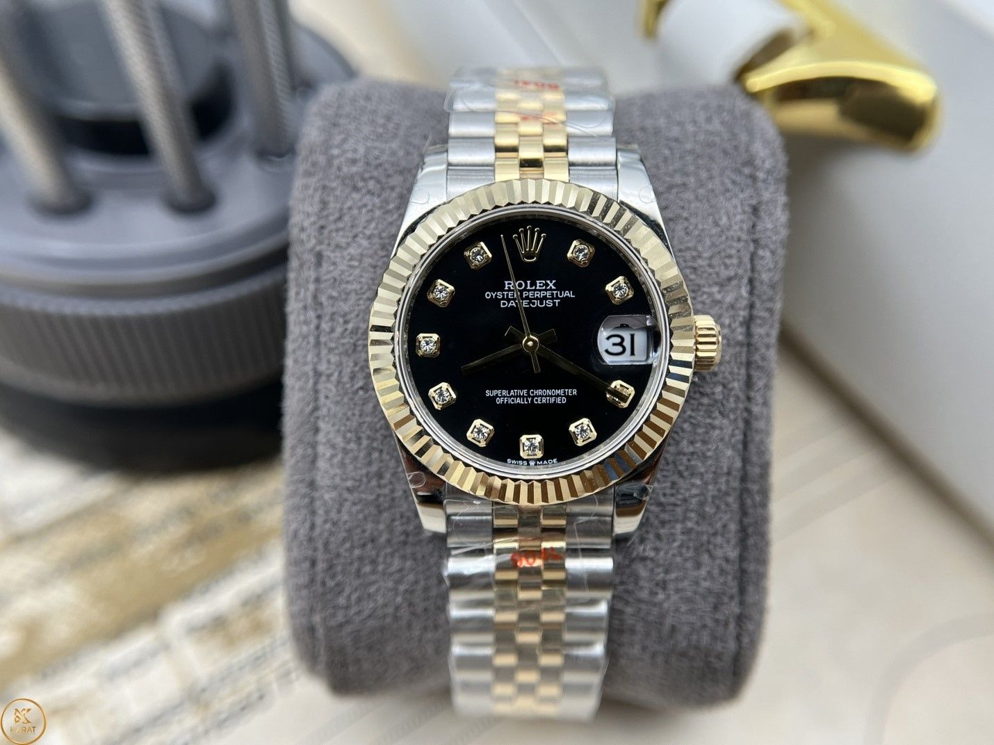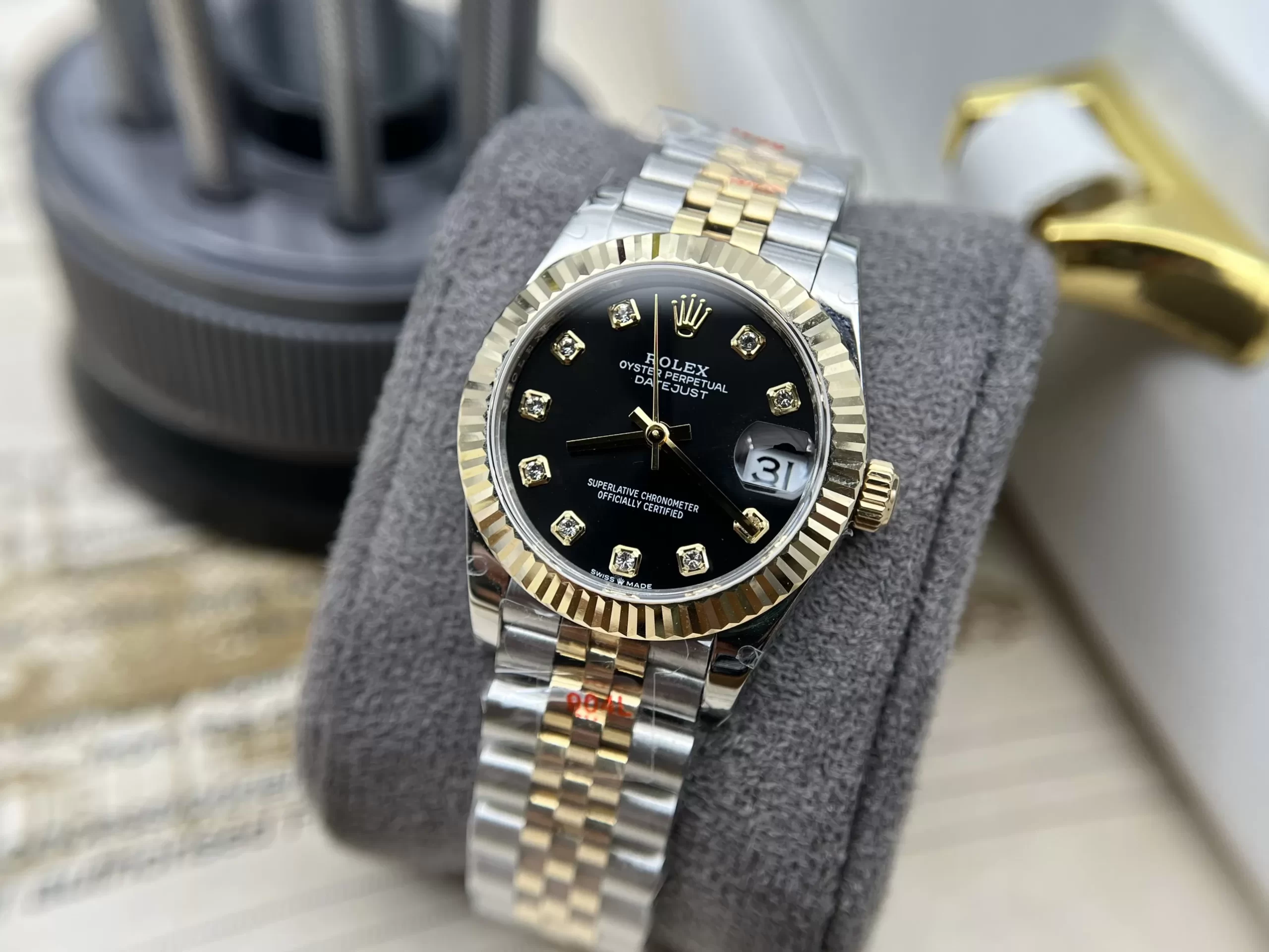 Trên nền mặt đen quyền quý, điểm chỉ giờ dạng hình vuông gắn viên đá trắng lấp lánh giúp nổi bật hơn. Các cọc số kim cương của đồng hồ Rolex replica được cắt gọt sắc sảo được bao quanh bởi viền 18k màu vàng vàng. Tại vị trí 3 giờ, ô cửa sổ hiển thị lịch ngày rõ nét dưới lớp kính tròng Cyclops có khả năng phóng đại.