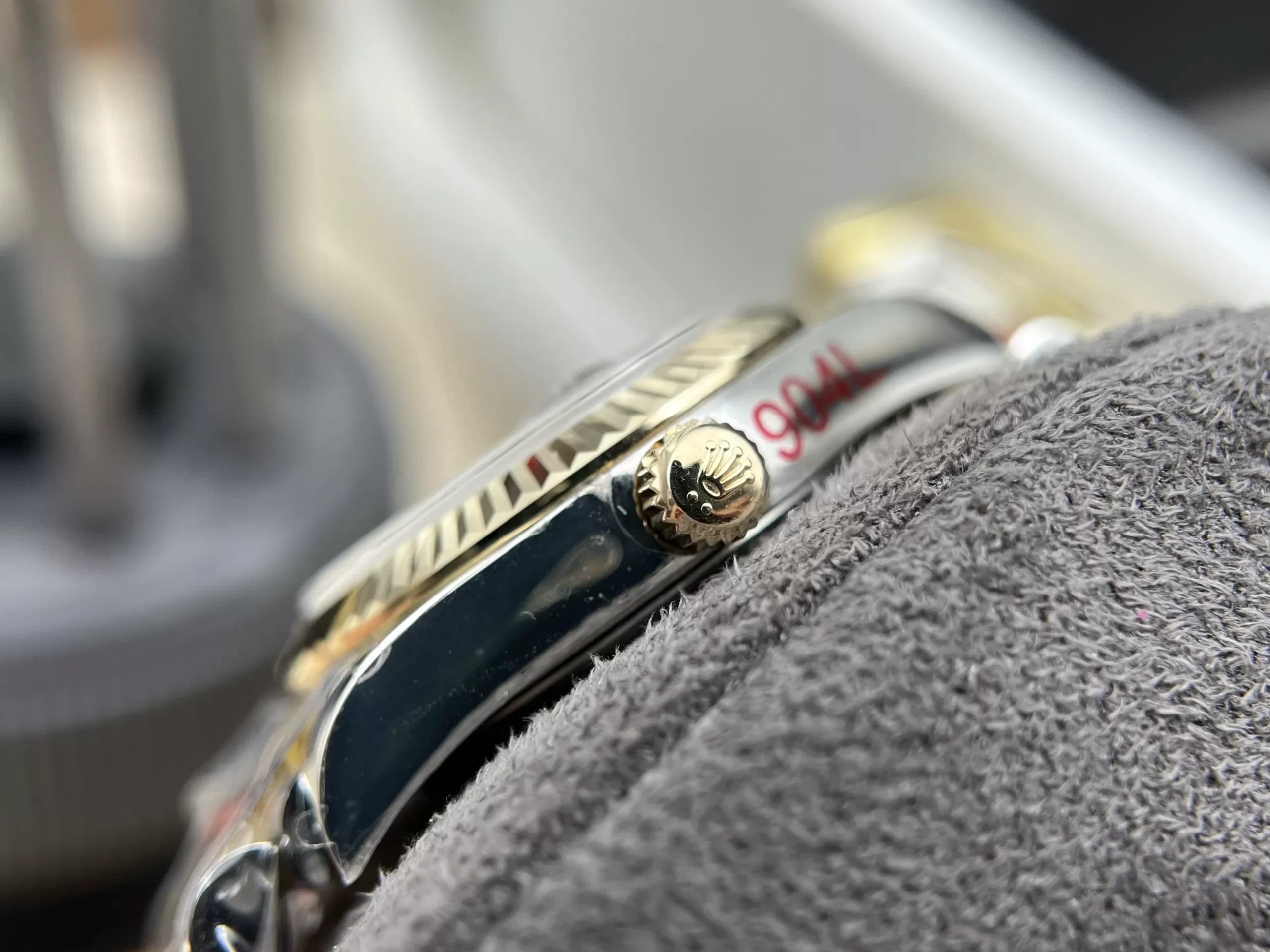 Biểu tượng hình vương miện ở vị trí 12 giờ toát lên vẻ đặc trưng của thương hiệu. Bao quanh mặt là vành bezel bằng chất liệu thép không gỉ 904L màu vàng vàng được kẻ đường rãnh. Chi tiết này giúp đồng hồ Rolex Datejust 116233 fake 1:1 toát lên vẻ nam tính mạnh mẽ.