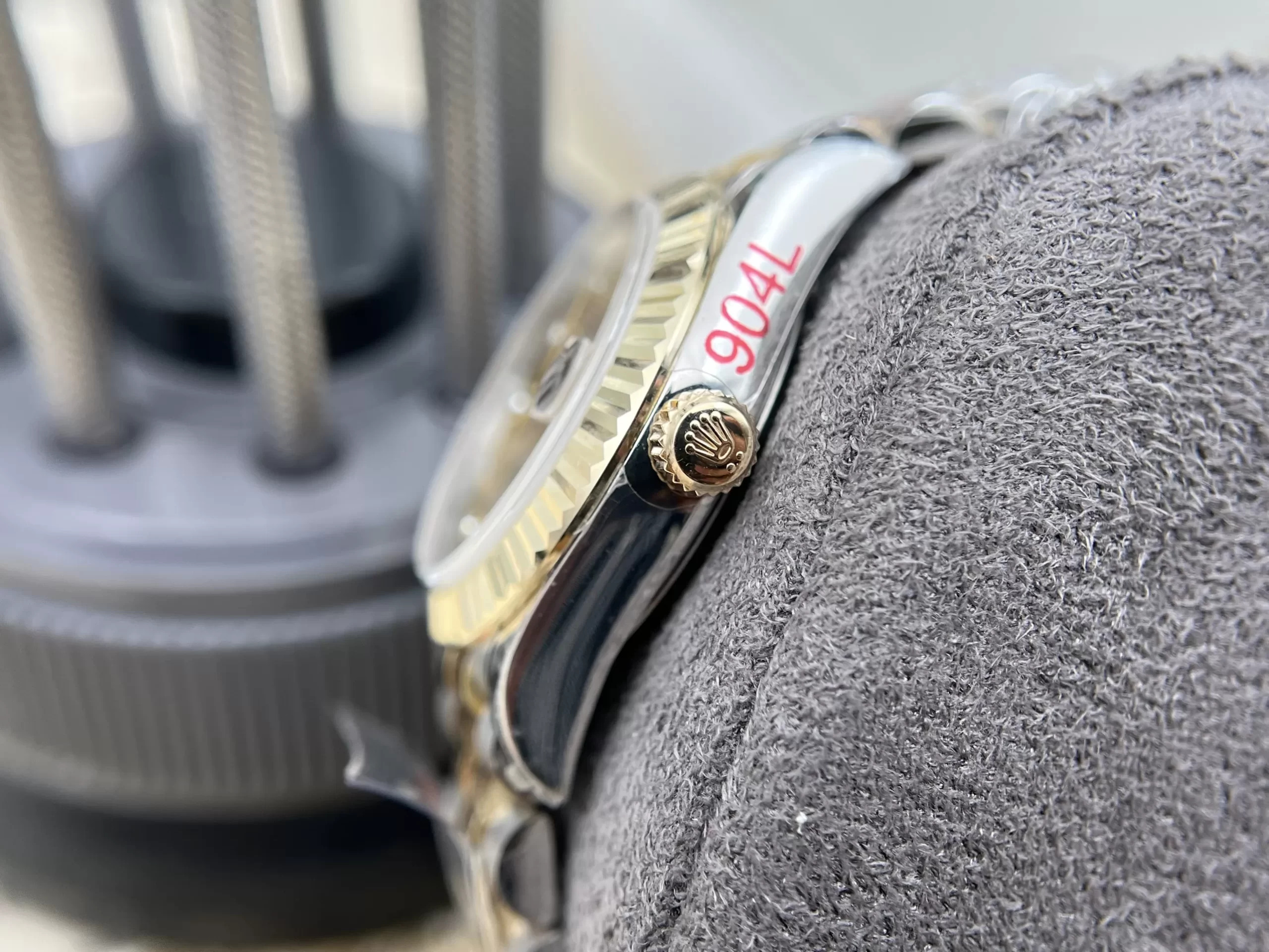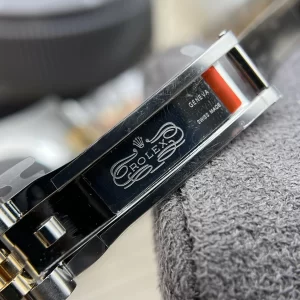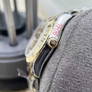 Bộ khung bao bọc đồng hồ Rolex Datejust 279173 fake bằng chất liệu thép 904L không gỉ. Bên cạnh mặt số đồng hồ Rolex fake cao cấp , núm điều chỉnh dạng tròn kẻ các rãnh răng cưa giúp người đeo dễ chỉnh sửa khi cần. Dây đeo tạo thành từ các mắt xích mang lại cảm giác thoải mái.