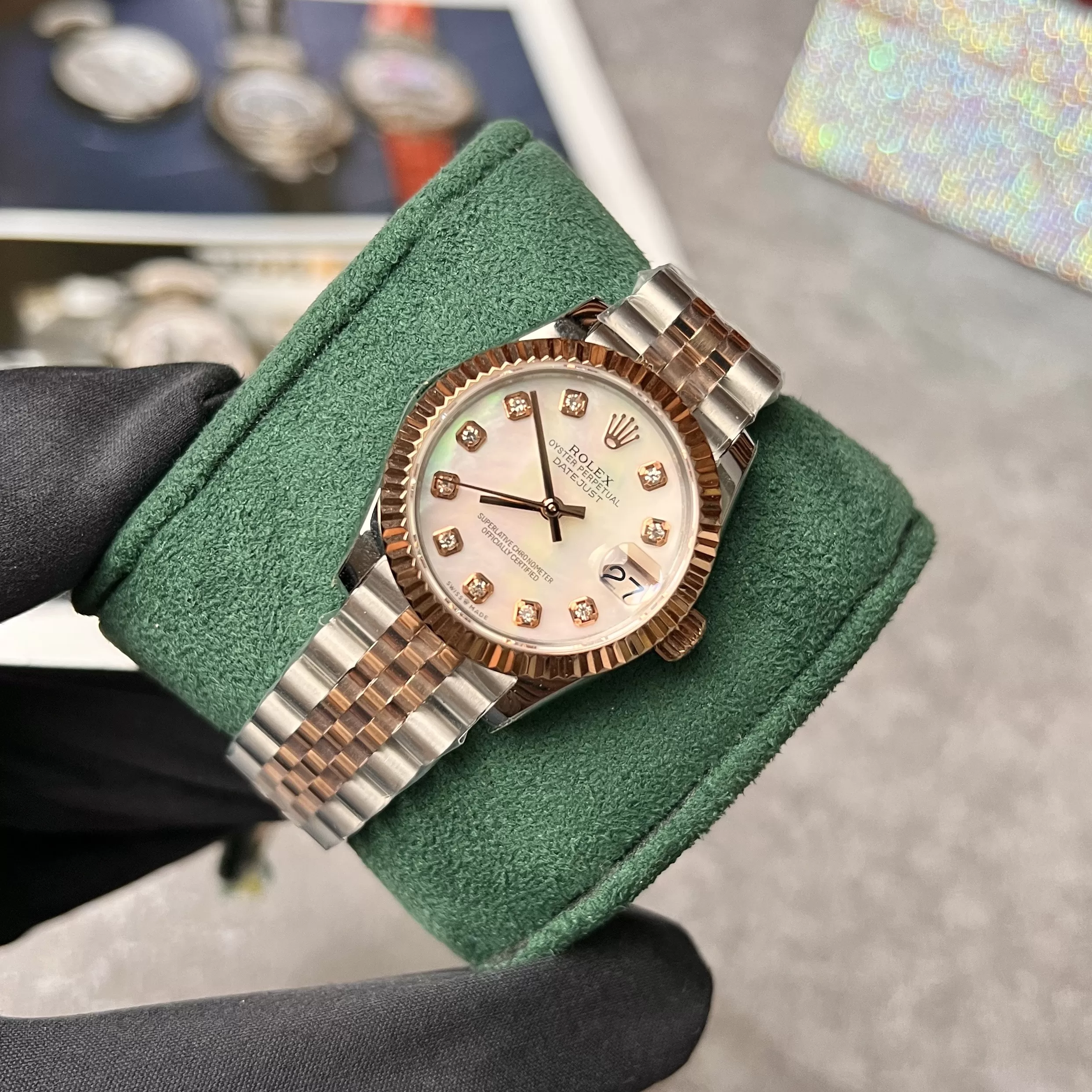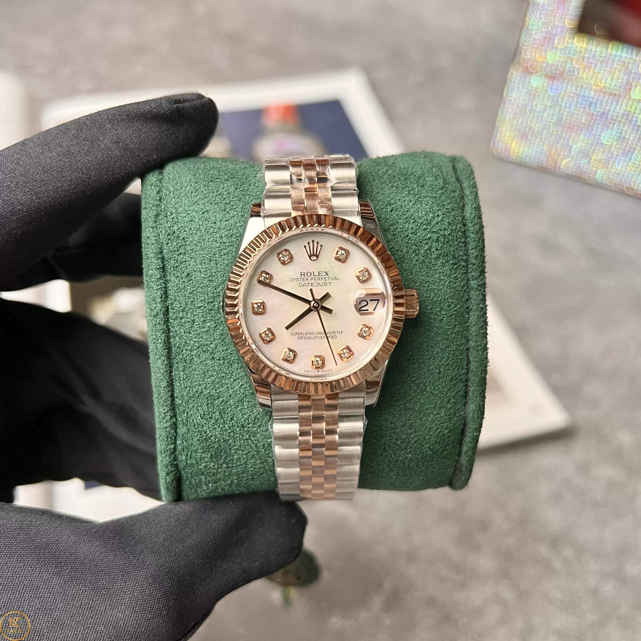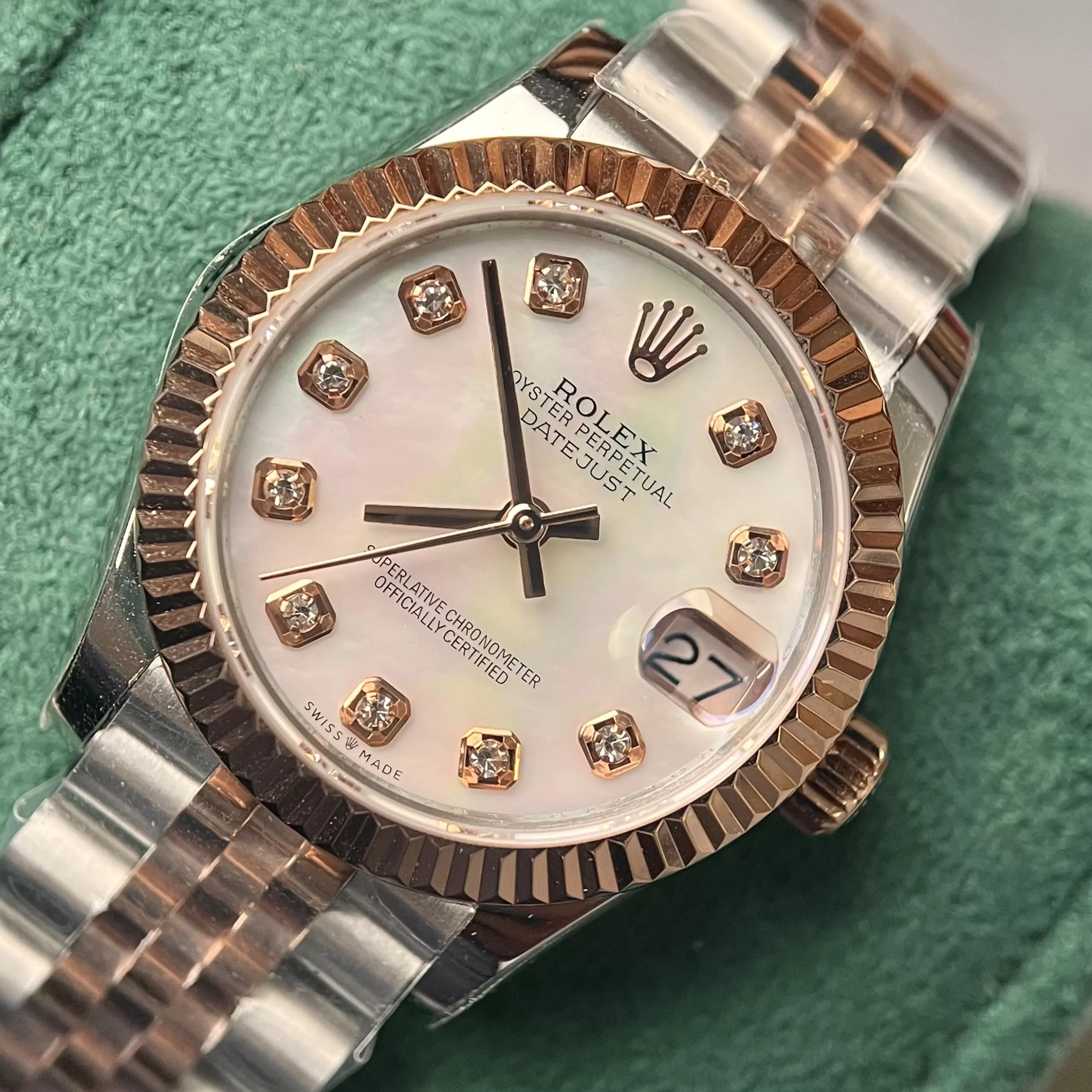 Mặt đồng hồ Rolex Datejust 31 278271-0026 Jubileesteel và vàng Everose super fake tông màu hồng nhạt trẻ trung, mới lạ. 10 cọc số hình vuông đính đá quý lấp lánh. Vị trí 12 giờ là vương miện của nhà Rolex. Tại vị trí 3h là cửa sổ ngày có chức năng phóng đãi cỡ lớn. Bộ kum quay hình baton màu đen di chuyển nhịp nhàng.