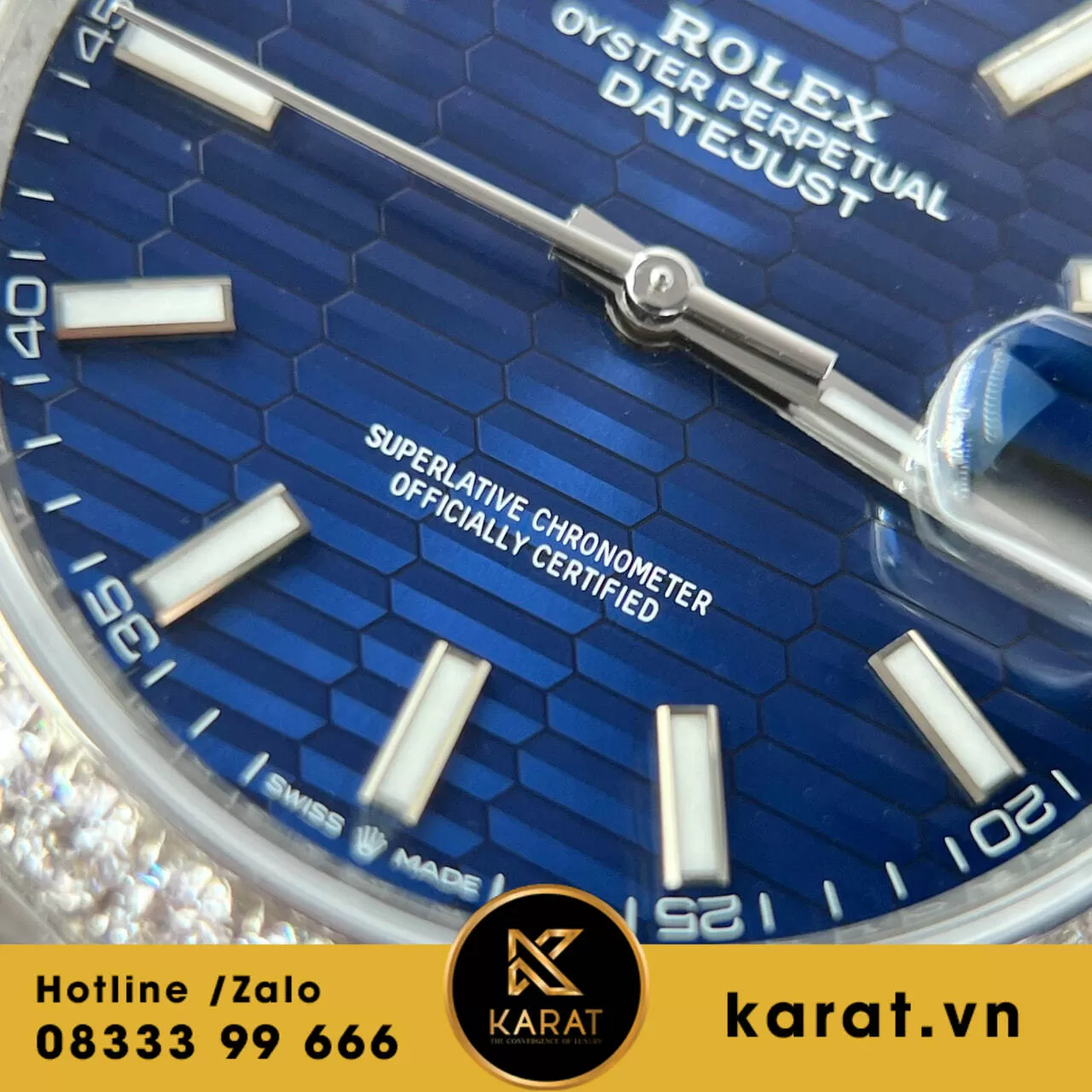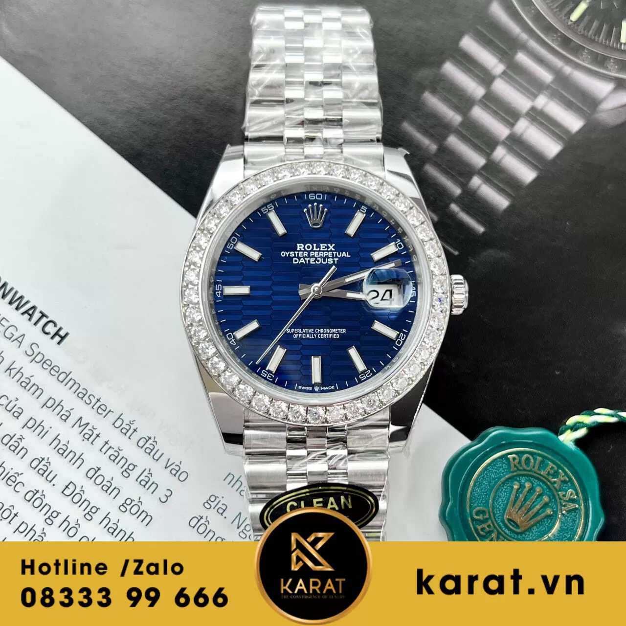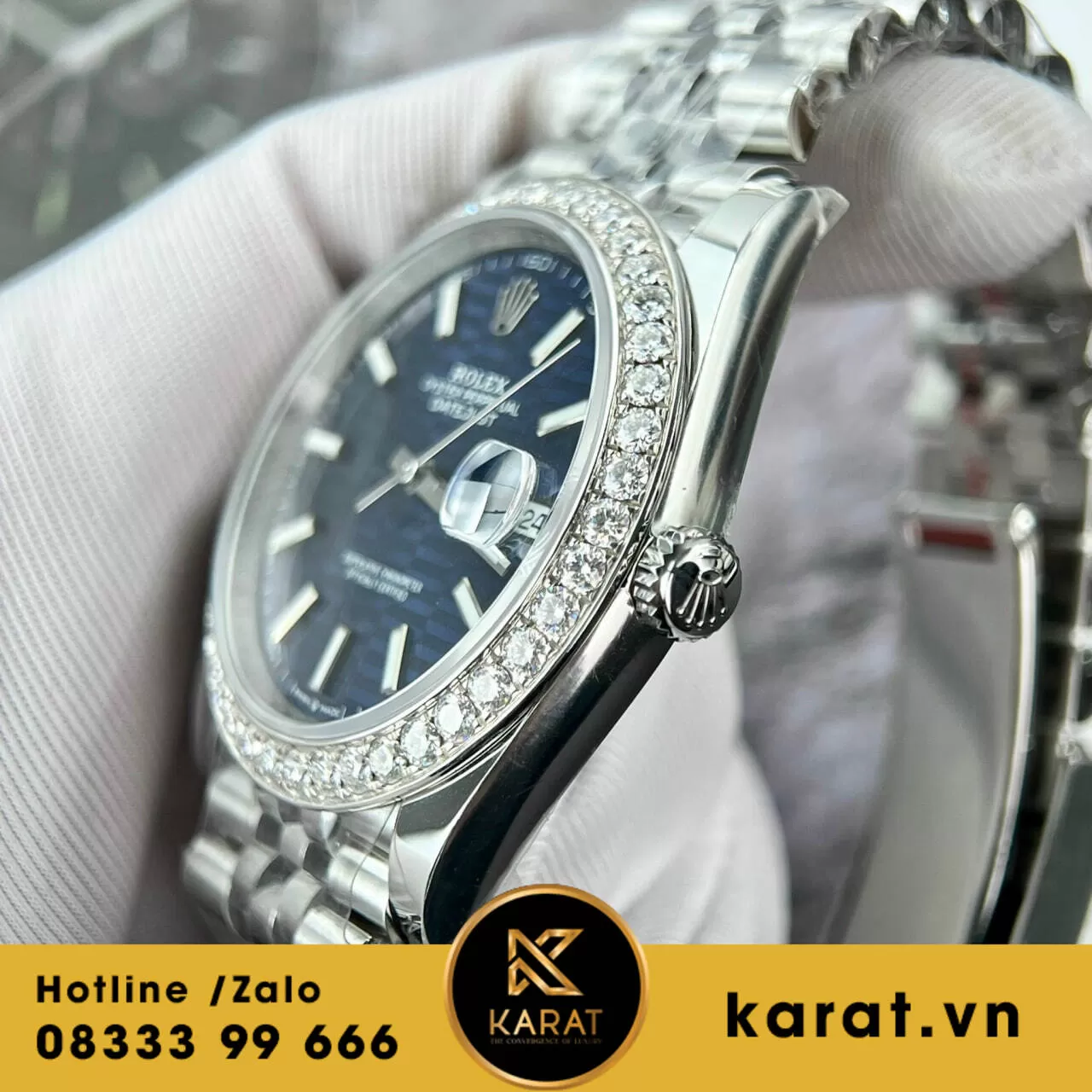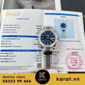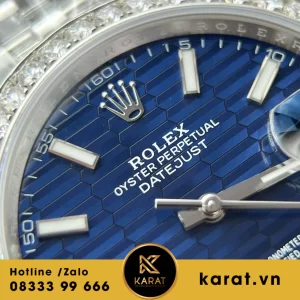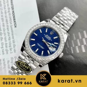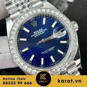 Đồng hồ rolex datejust 41 mặt xanh dương vân nếp gấp viền moissanite replica