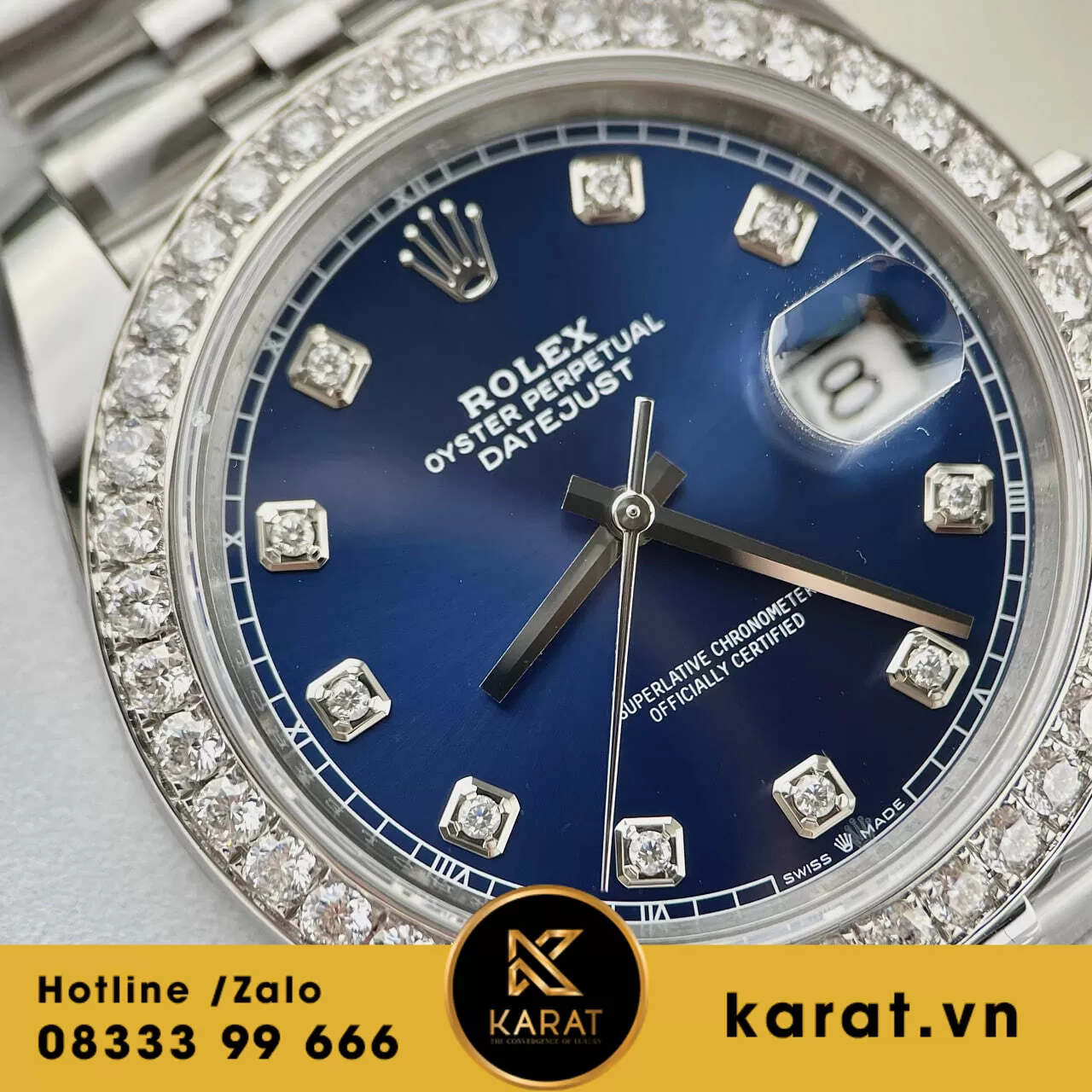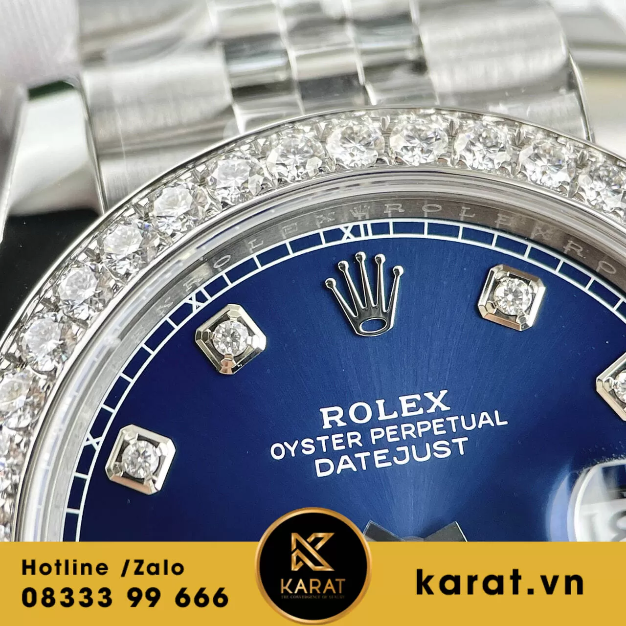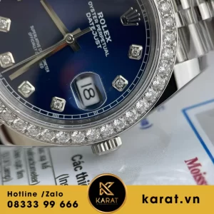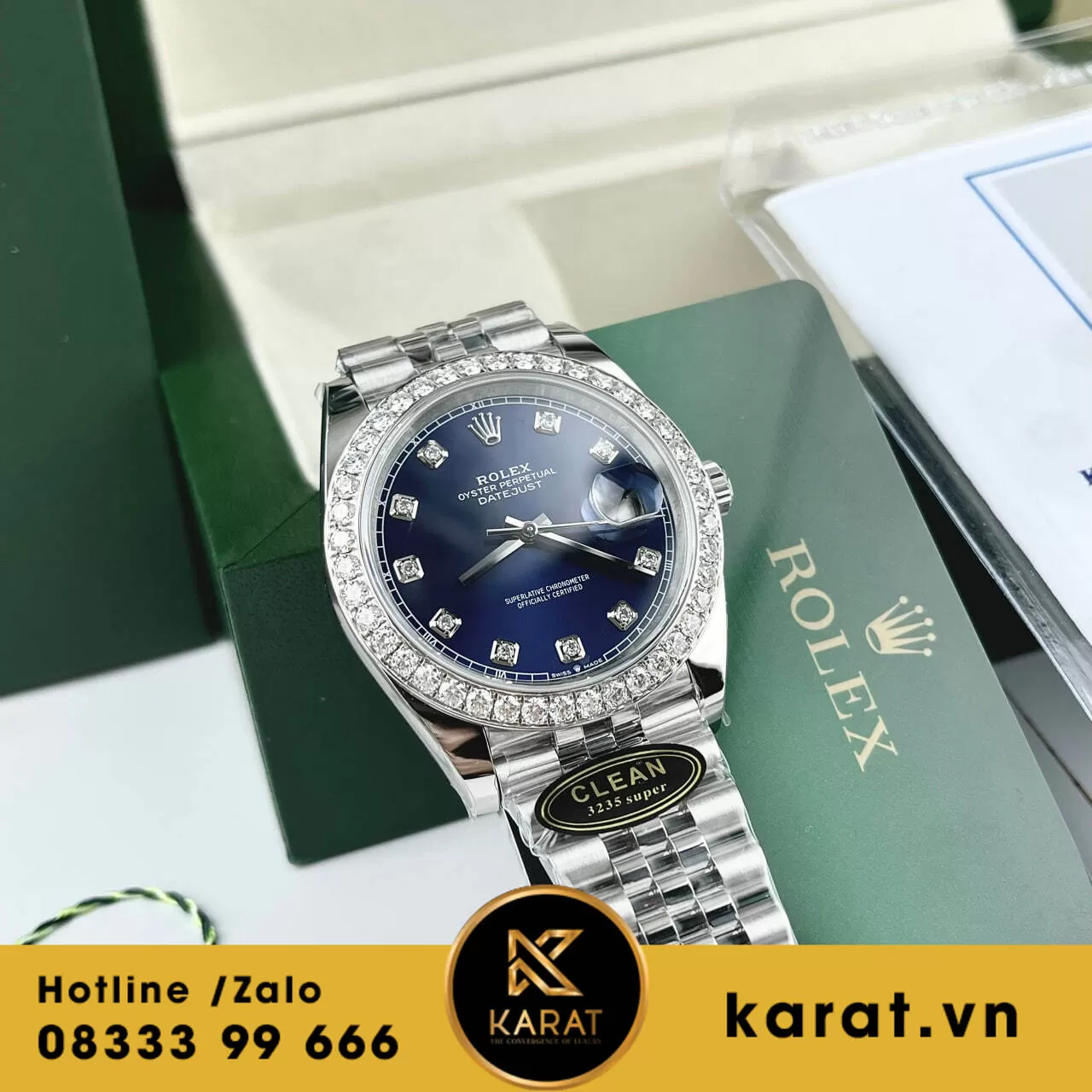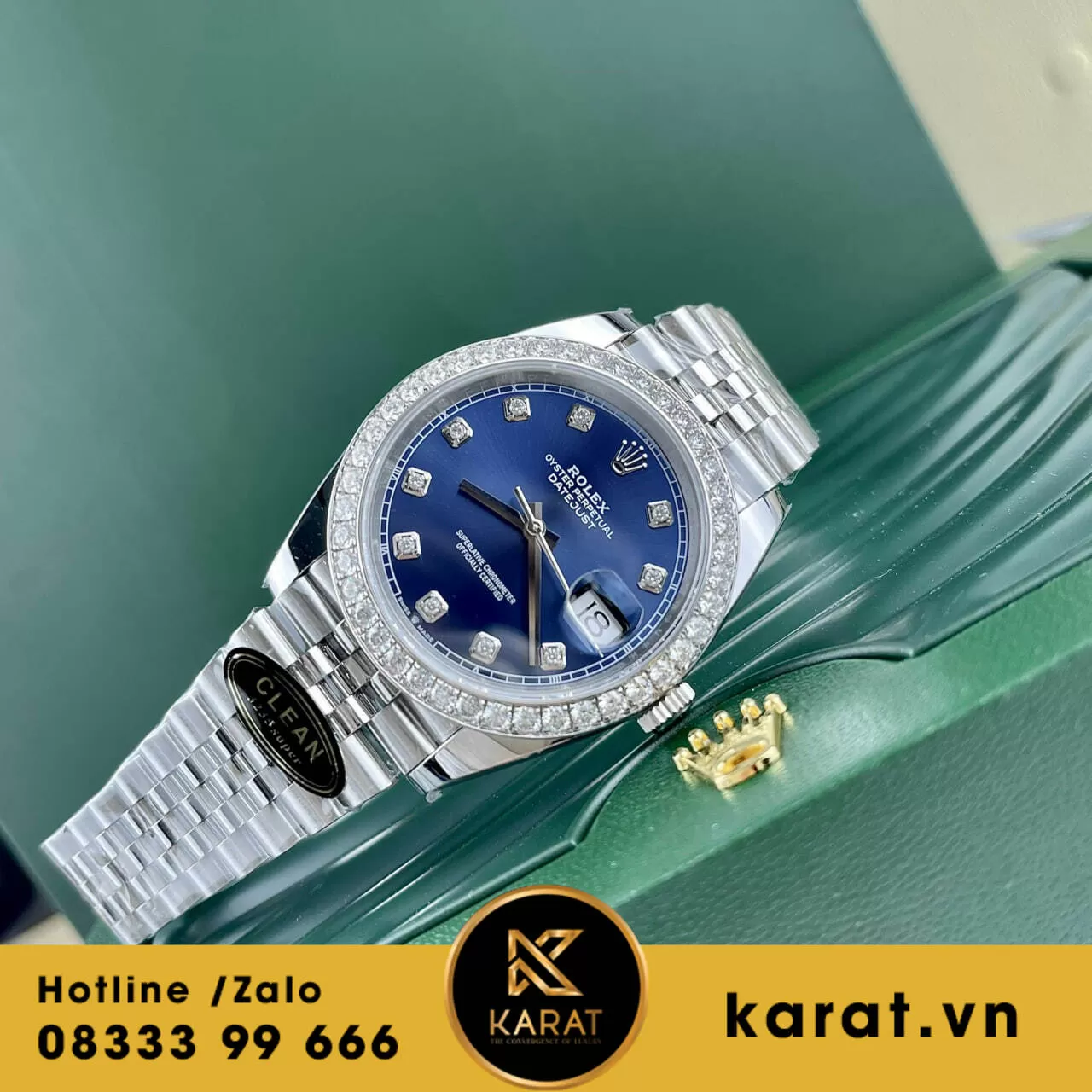 Đồng hồ rolex datejust 41 mặt xanh dương viền moissanite replica