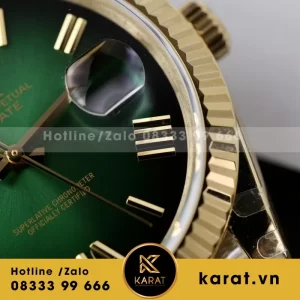 Mặt số Ombre xanh lá độc đáo, cọc số kim cương và kim vàng 18K nổi bật. Hai ô hiển thị thứ và ngày đặt ở 12h và 3h tiện lợi, tạo điểm nhấn sang trọng.