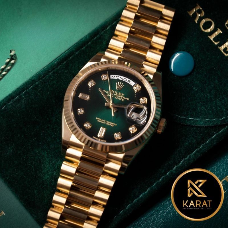Đồng Hồ Rolex Day-Date 128238 Màu Xanh Lá Ombre là biểu tượng hoàn hảo của đẳng cấp và tinh tế. Sở hữu mặt số xanh Ombre chuyển sắc cuốn hút, kết hợp cùng bộ vỏ vàng 18K sang trọng, chiếc đồng hồ toát lên vẻ xa xỉ khó cưỡng. Bộ máy QF hoạt động ổn định, độ hoàn thiện tinh xảo đến từng chi tiết. Cùng Karat – đồng hồ chế tác cao cấp khám phá kiệt tác thời gian mang dấu ấn hoàng gia này.