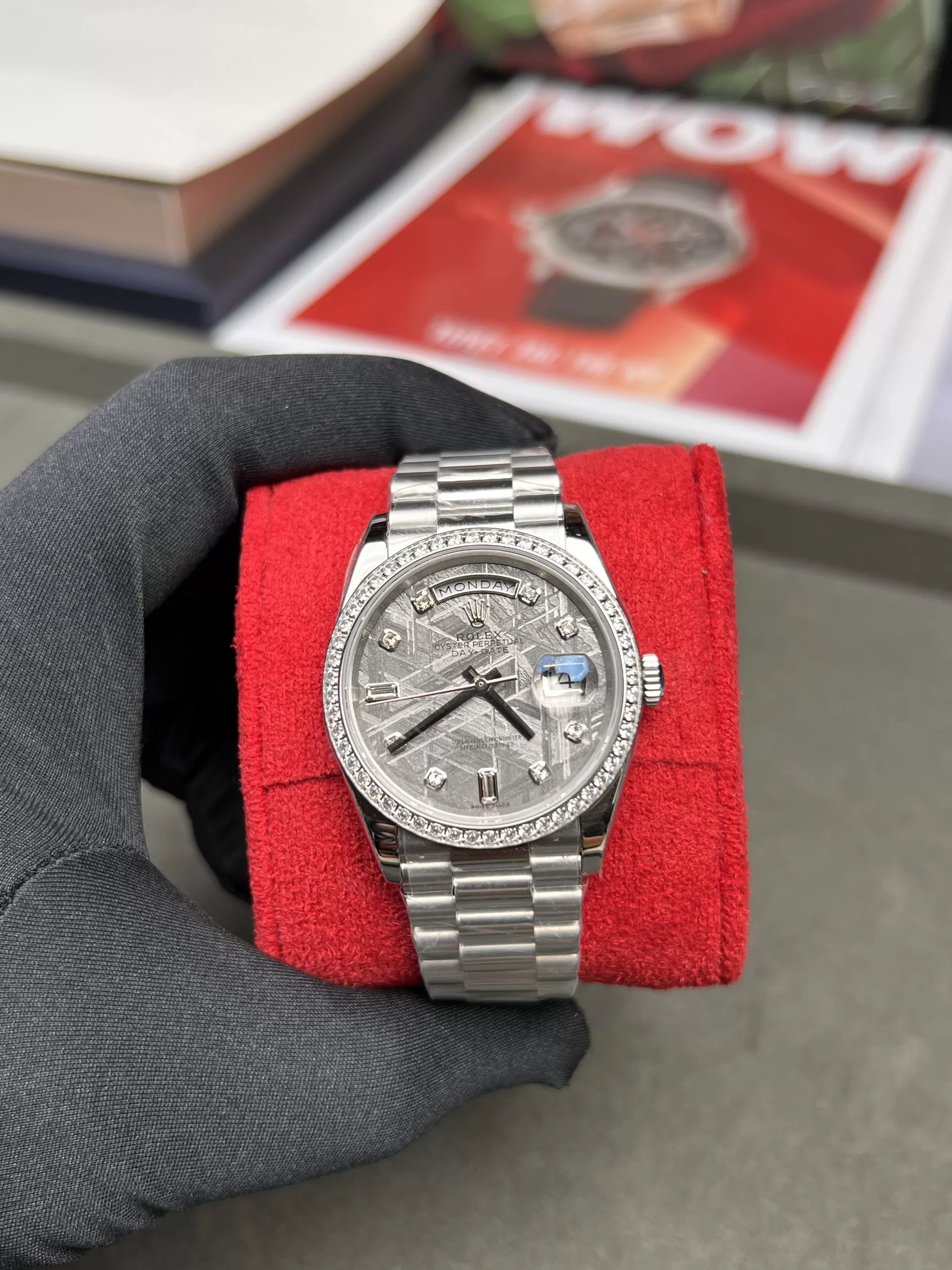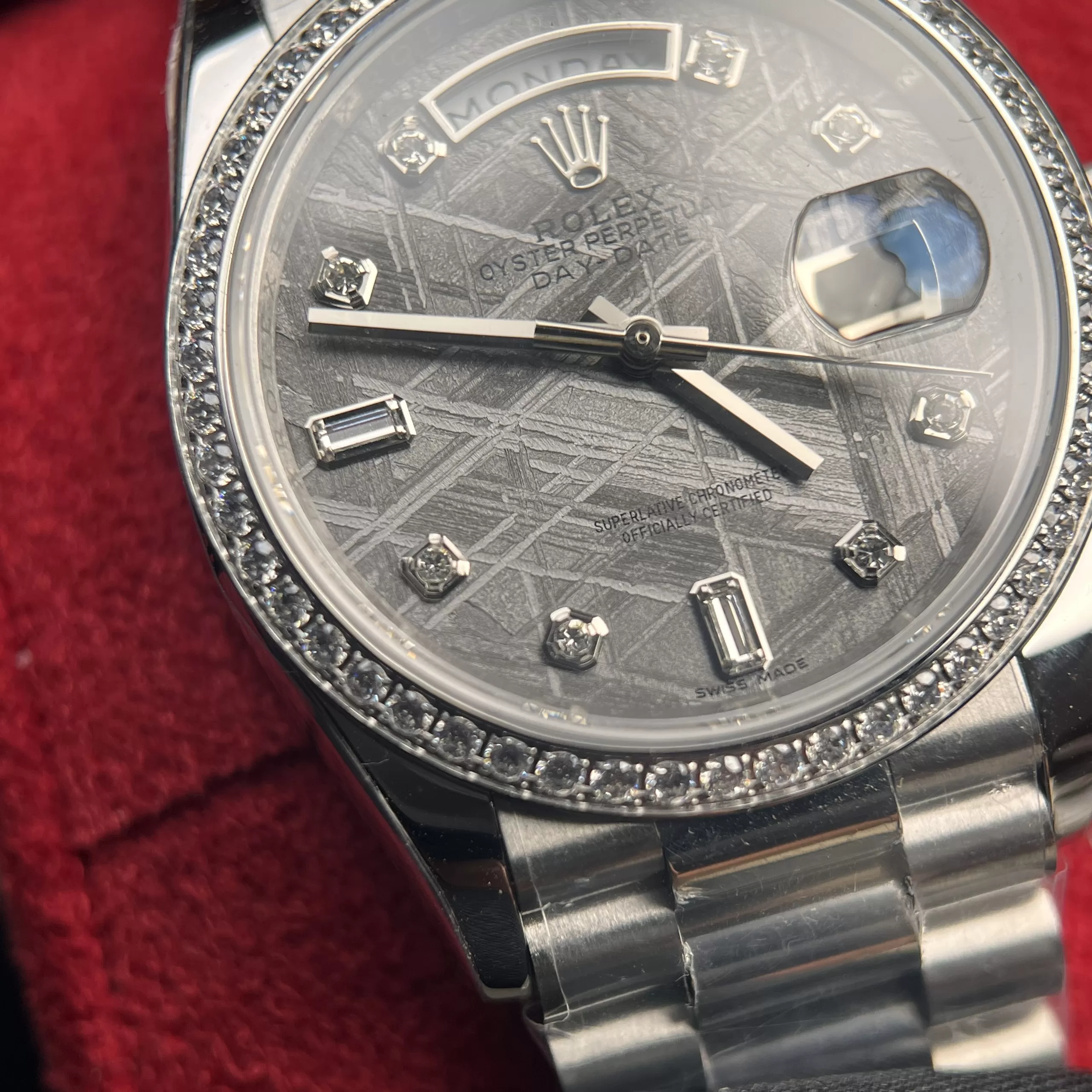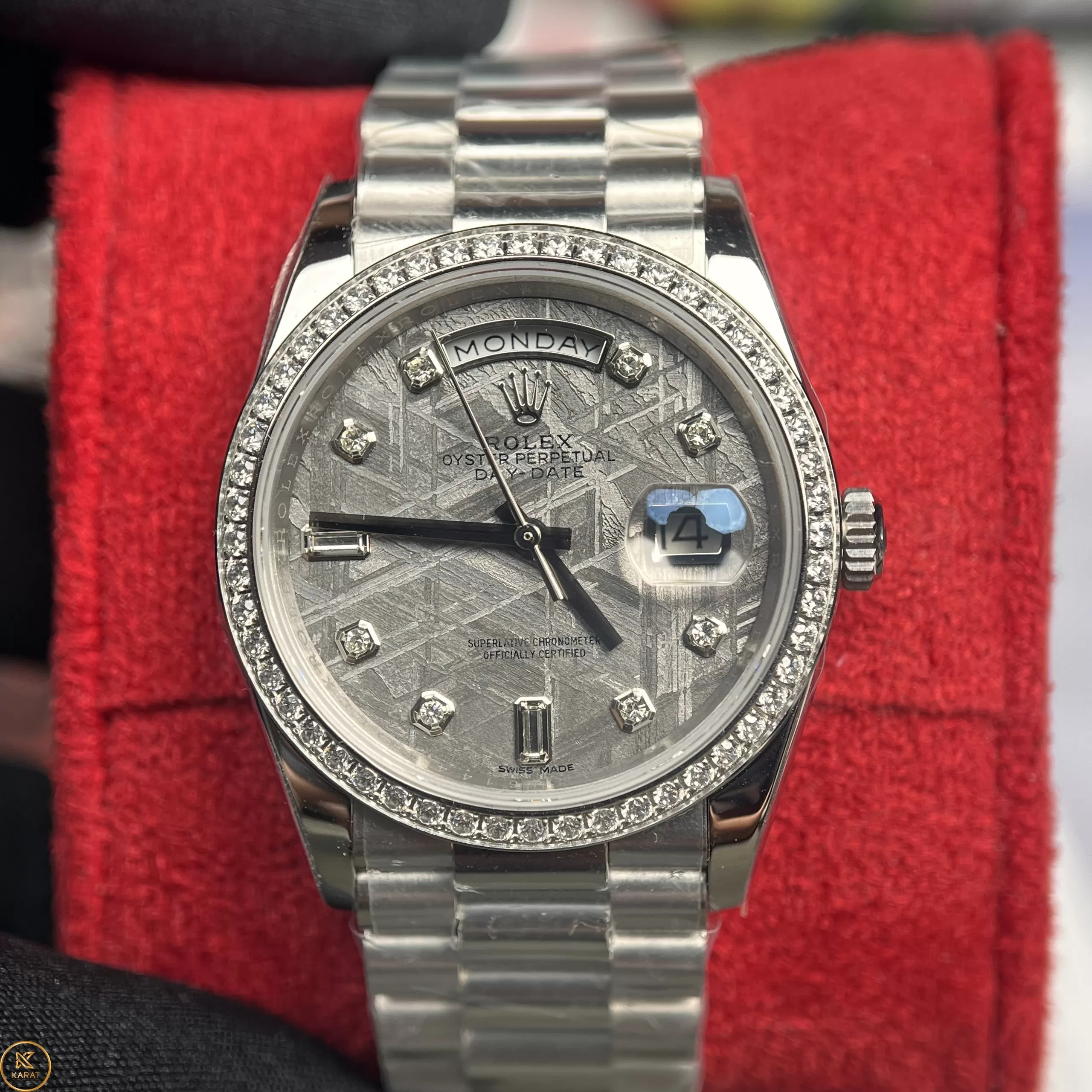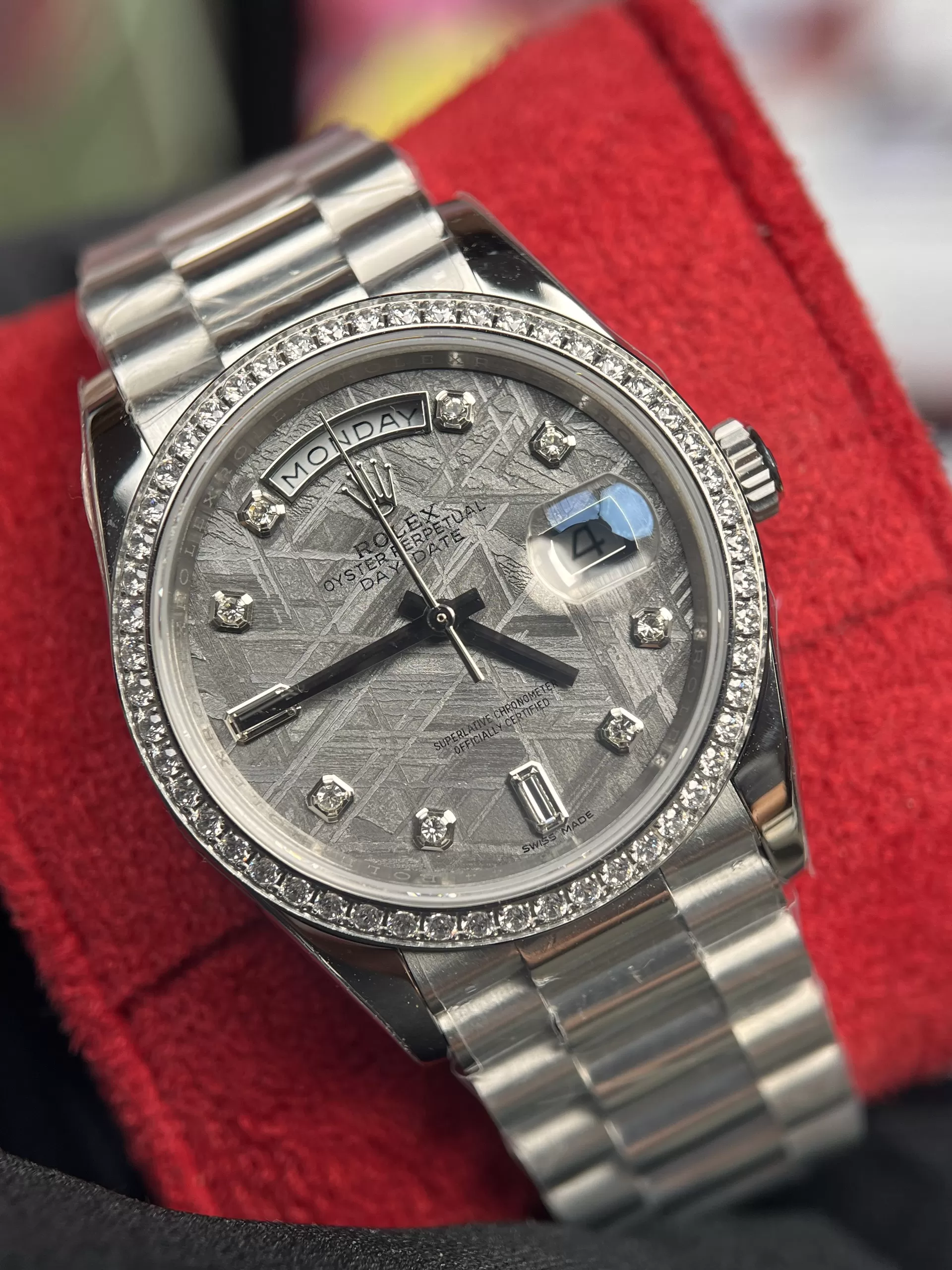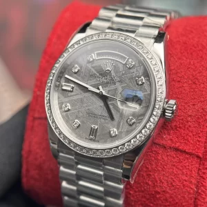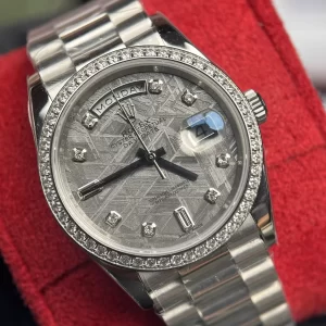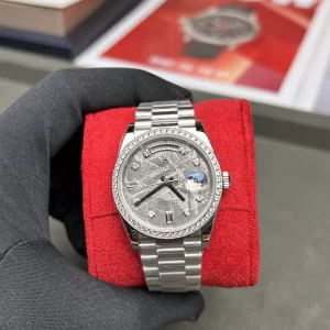 Đồng Hồ Rolex Day-Date 228349 Mặt Số Khảm Trai Viền Kim Cương Moissanite Like Auth