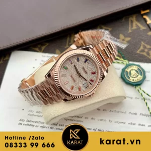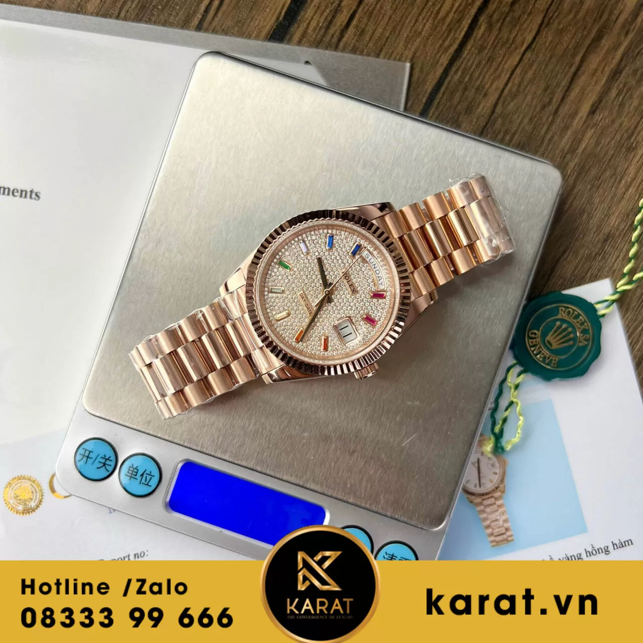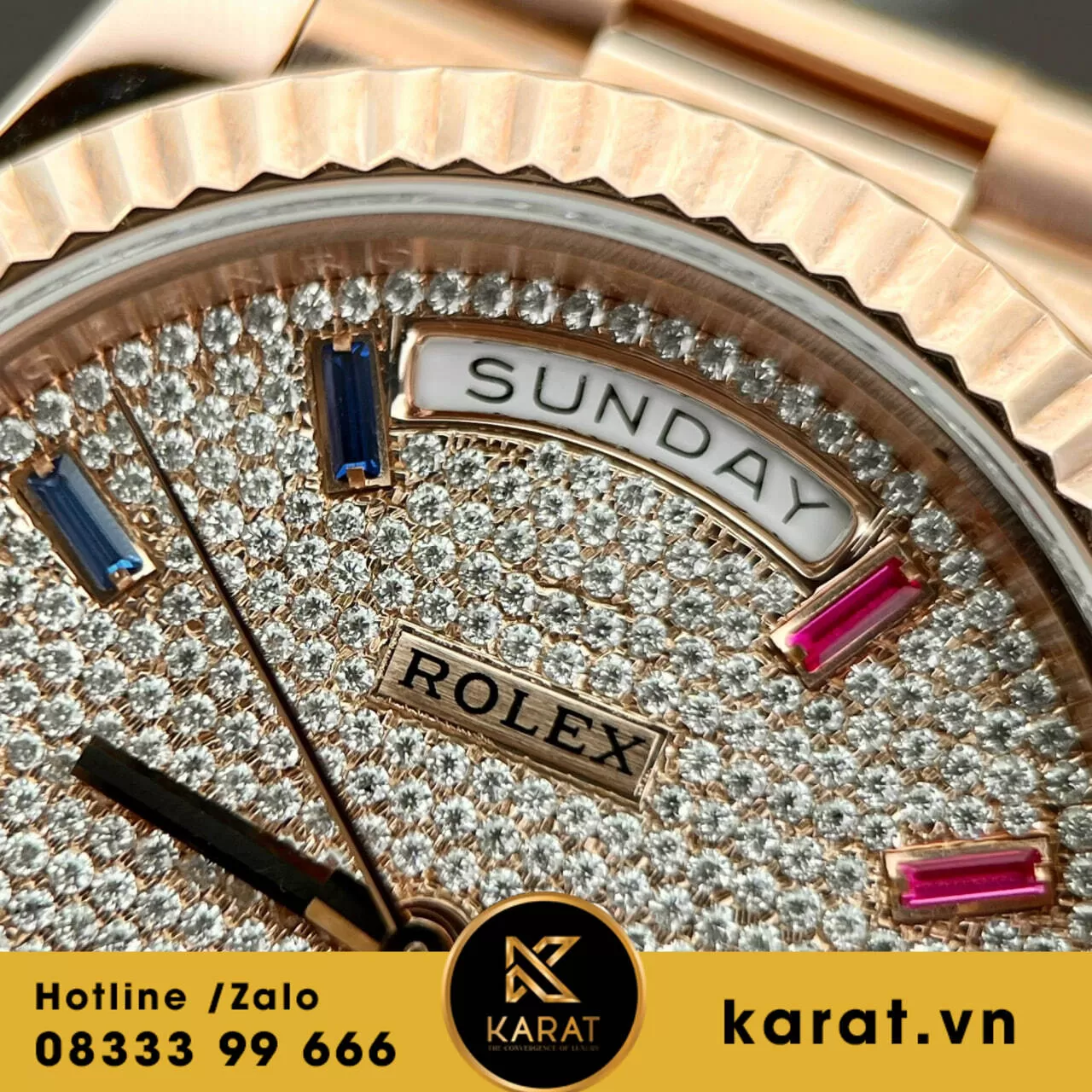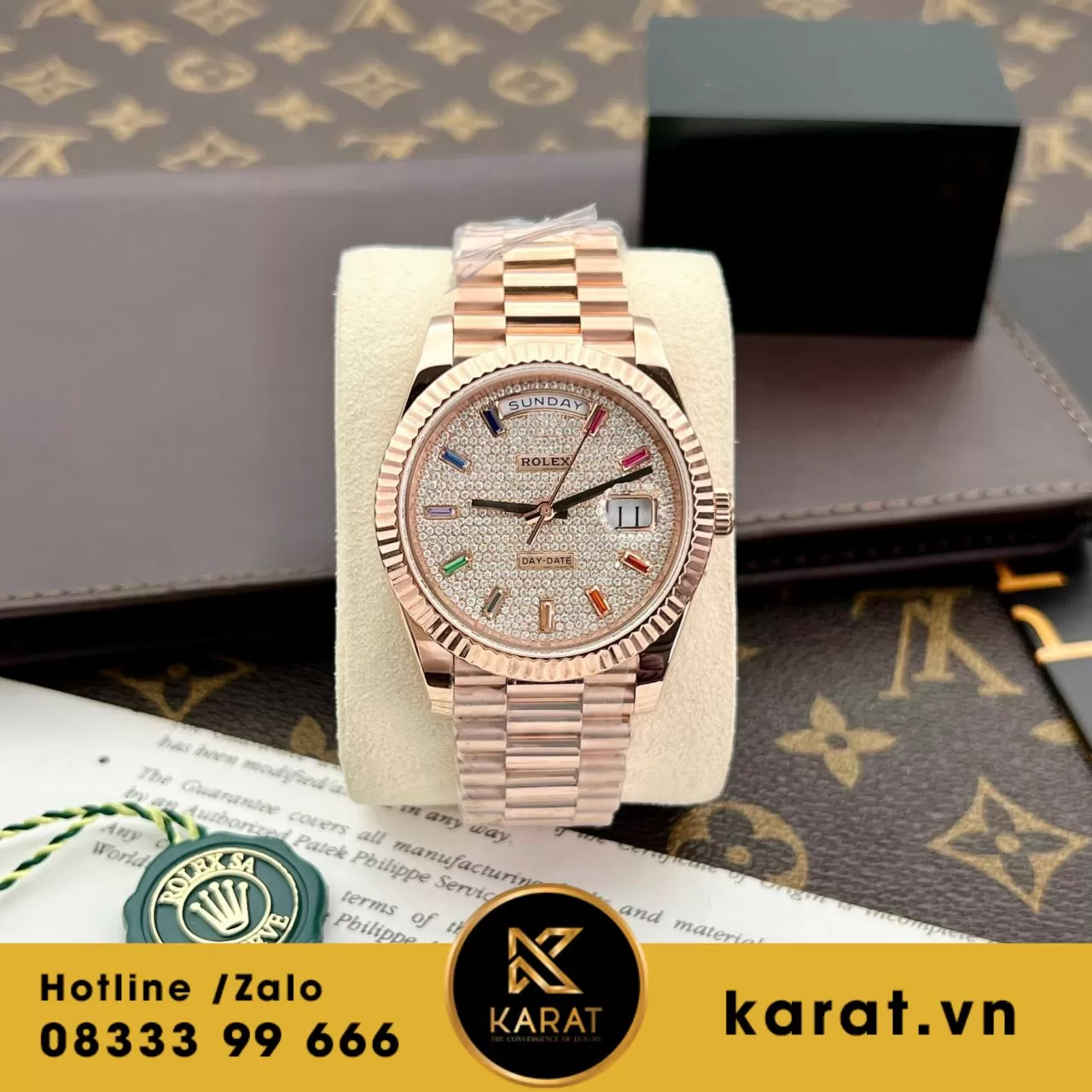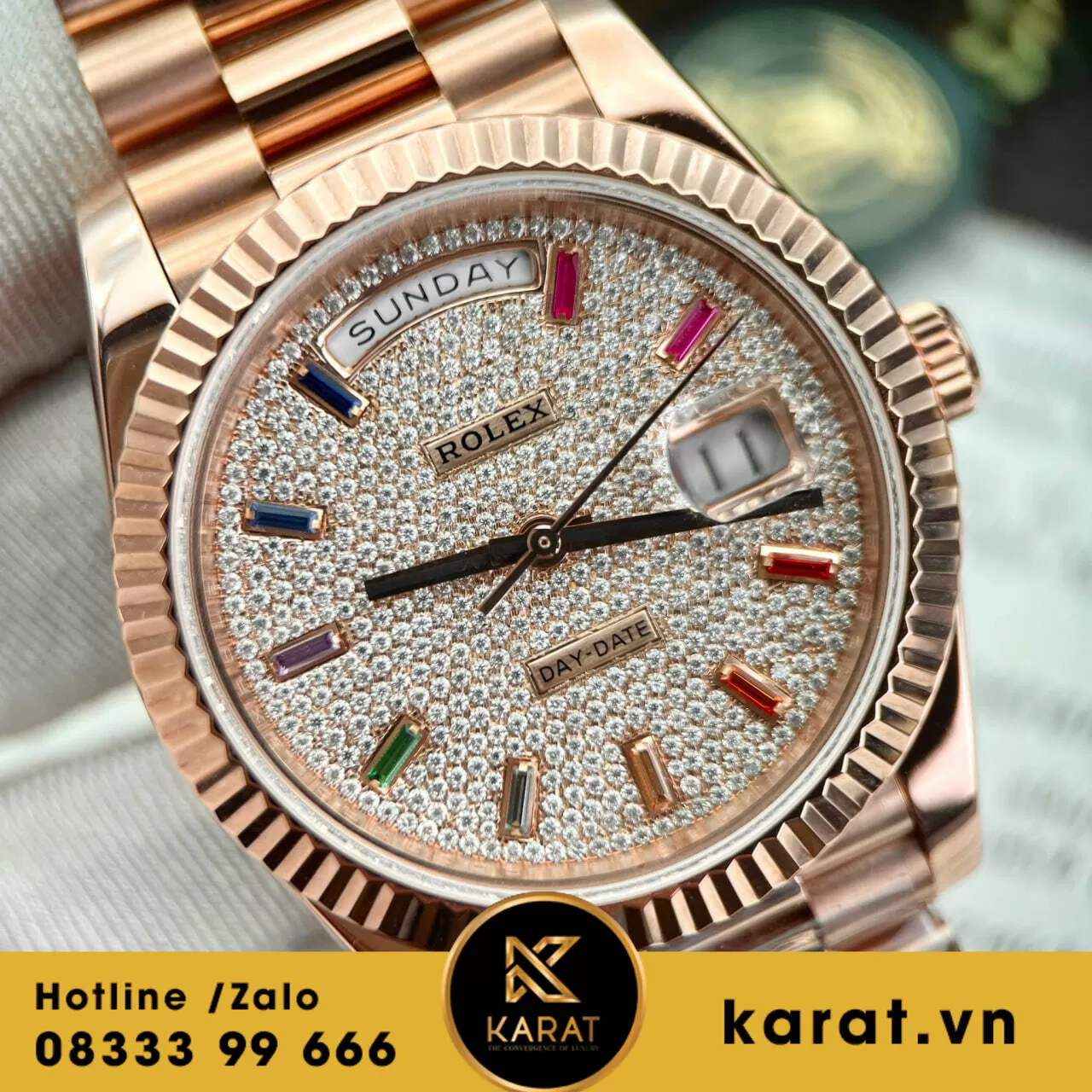 Đồng hồ rolex Day Date 40 rainbow Bọc Vàng 18k Kim Moissanite