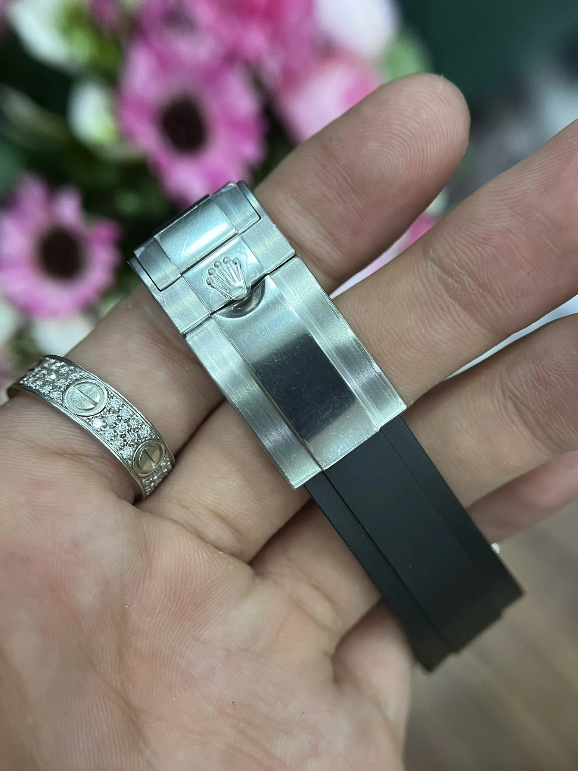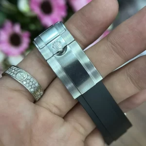 Dây đồng hồ Rolex Daytona 116519 Mặt Số Xanh Ngọc Viền Full Đá replica làm bằng chất liệu cao su thiên nhiên hạng sang. Dây đeo màu đen, khóa cài chắc chắn giúp người dùng an tâm trong mọi hoạt động.