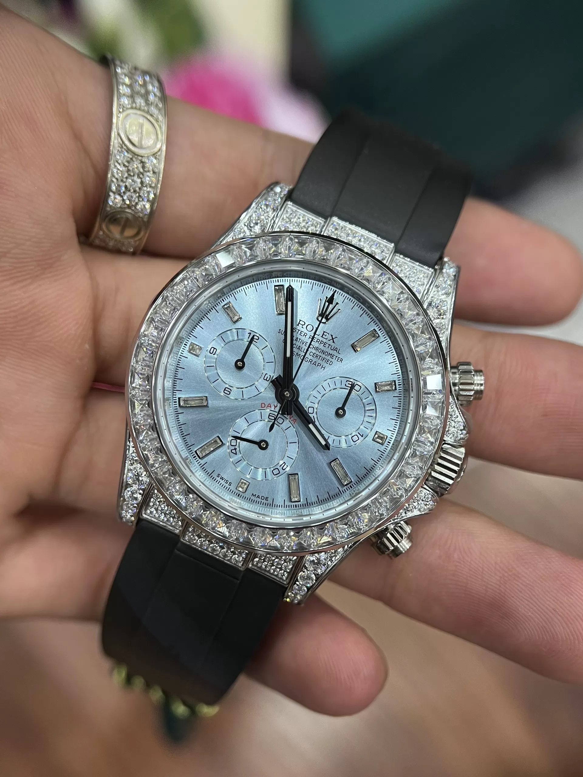 Hai tai đồng hồ full đá quý. Vành bezel cũng được khảm đá lấp lánh. Mặt số Rolex Daytona 116519 Mặt Số Xanh Ngọc Viền Full Đá geneve fake tinh tế, đẹp mắt. 11 cọc số baton cũng bằng đá quý. 3 mặt số phụ thiết kế cân đối với chức năng riêng. Bộ kim quay màu đen di chuyển nhịp nhàng đảm bảo độ chuẩn xác tuyệt đối,