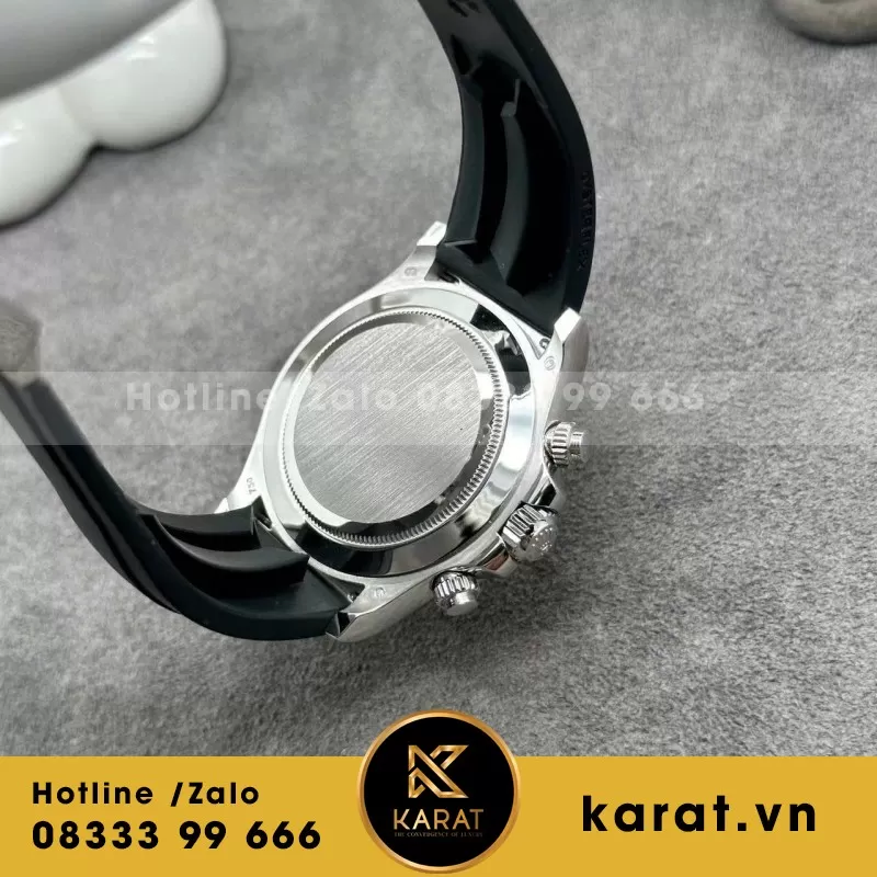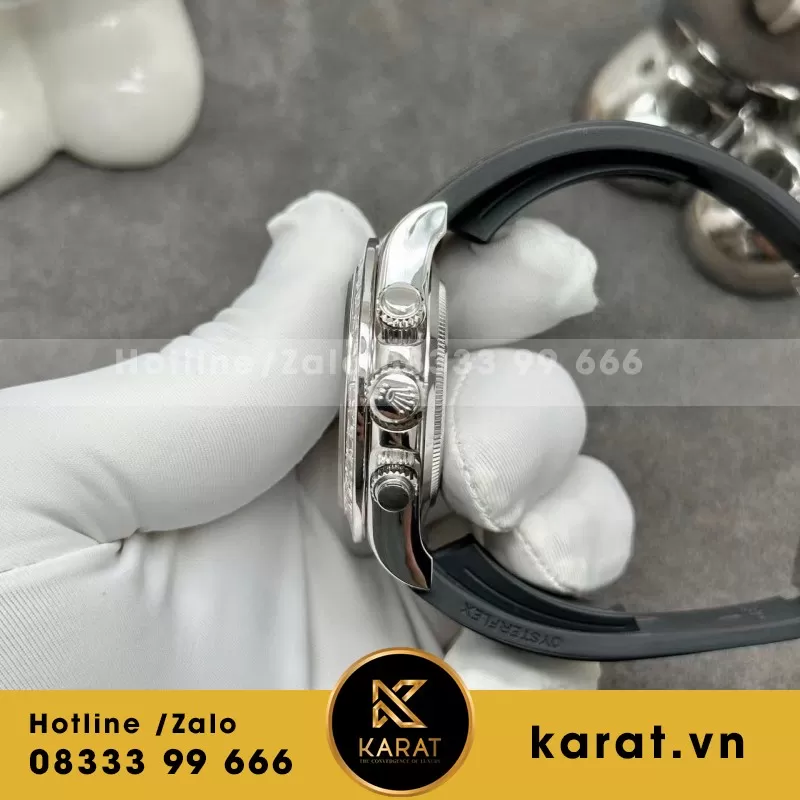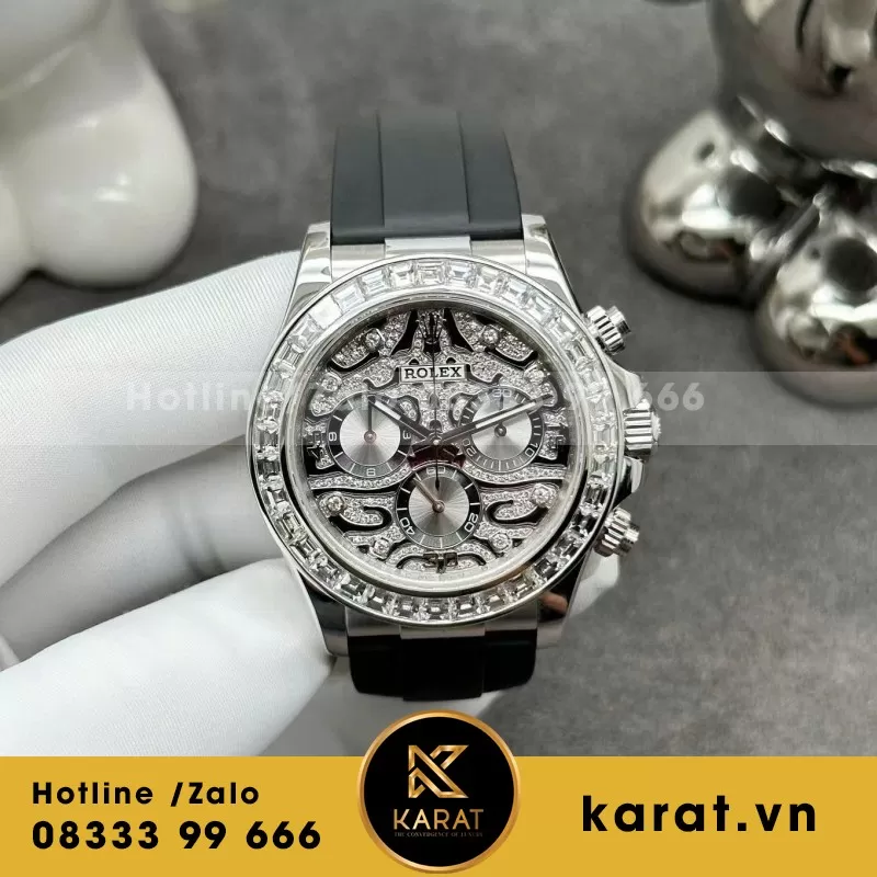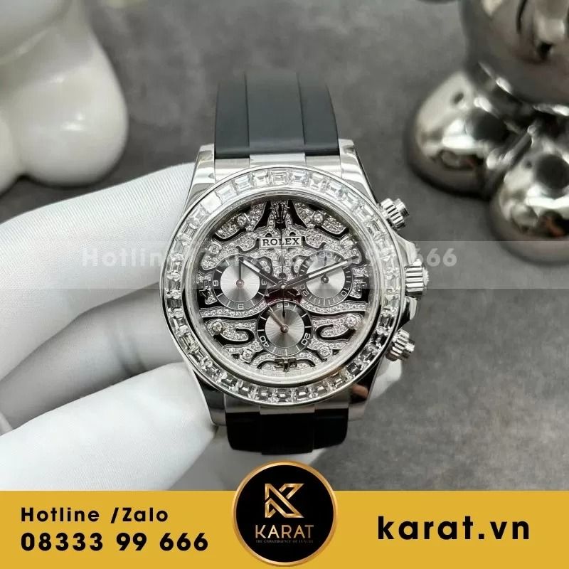 Karat.vn chế tác đồng hồ lấy cảm hứng từ Rolex Daytona 116589TBR Eye Of Tiger với kỹ thuật thủ công tinh xảo, mang đến sản phẩm chất lượng cao ở mức giá hợp lý. Đội ngũ nghệ nhân dày dặn kinh nghiệm tái hiện từng chi tiết sắc nét, kết hợp tư vấn cá nhân hóa, dịch vụ bảo hành tận tâm, giúp bạn dễ dàng sở hữu rolex daytona rep phiên bản vàng trắng đính kim cương sang trọng và nổi bật.