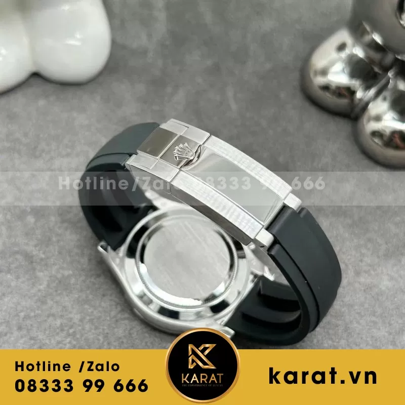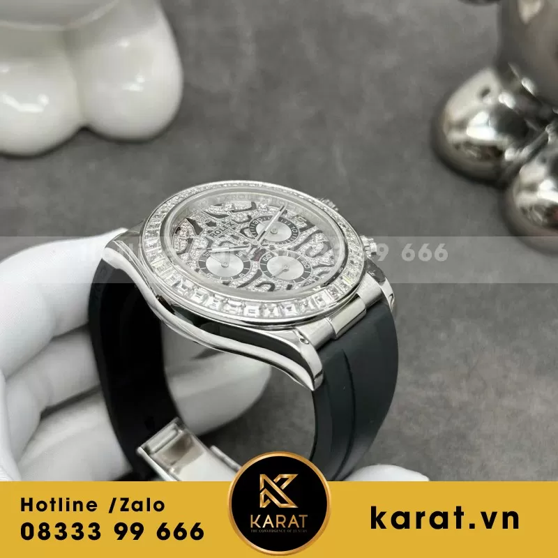 Bộ vỏ từ vàng trắng 18K chế tác tinh xảo, đường kính 40mm và dày 12.4mm, tạo cảm giác chắc chắn mà không lấn át. Bezel đính kim cương thiên nhiên lấp lánh, chống nước đến 100m nhờ crown vặn vít, đảm bảo độ bền cao cho người dùng năng động.