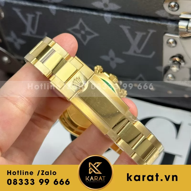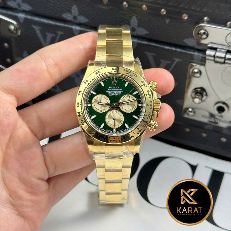 Mặt số xanh Green đặc trưng, kim giờ và cọc số vàng nổi bật với lớp phủ dạ quang, dễ quan sát trong mọi điều kiện ánh sáng. Đồng hồ trang bị đầy đủ chức năng Chronograph, ô hiển thị ngày tiện dụng và thiết kế cân đối, vừa hiện đại vừa tinh tế, thể hiện kỹ nghệ chế tác đỉnh cao của Rolex.