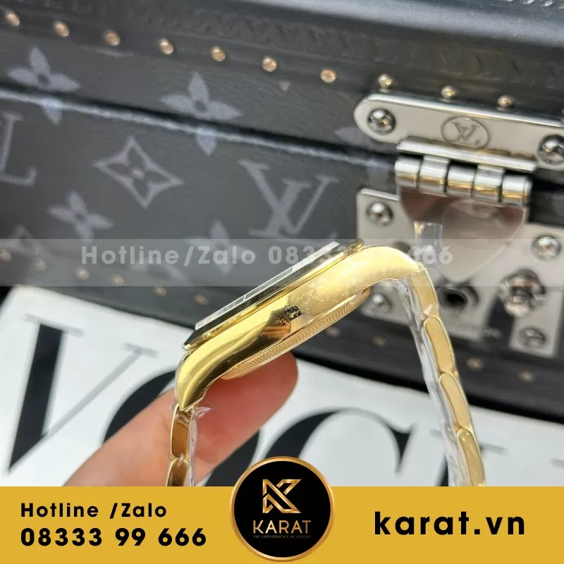Bộ vỏ 40mm chế tác từ thép 316L mạ vàng 18K nguyên khối, cứng cáp và bền màu. Viền bezel tinh xảo, phản chiếu ánh sáng rực rỡ, tạo điểm nhấn sang trọng và thể thao. Kích thước chuẩn mực giúp đồng hồ vừa vặn với cổ tay, phù hợp cả khi đi làm hay tham dự sự kiện quan trọng.
