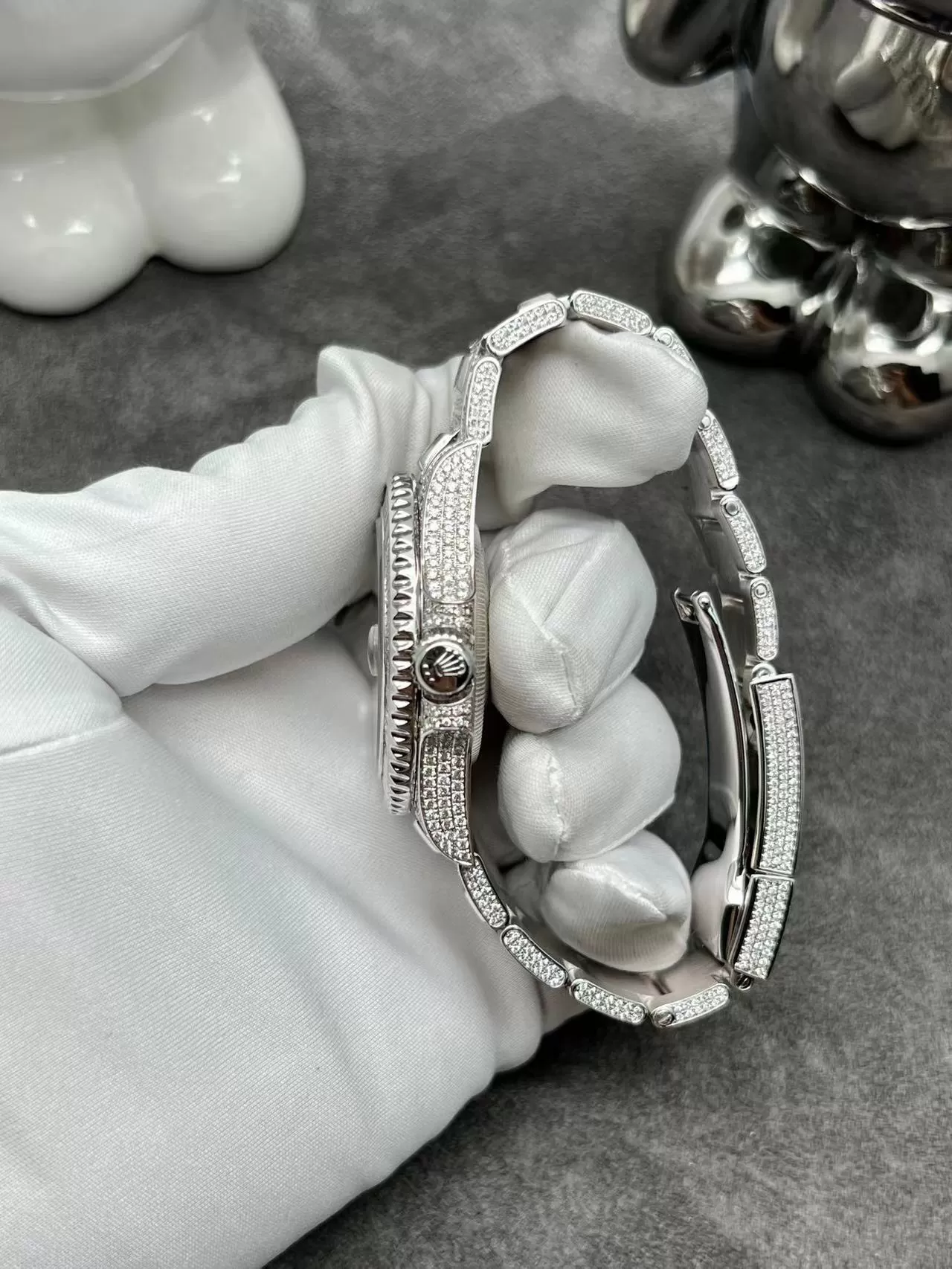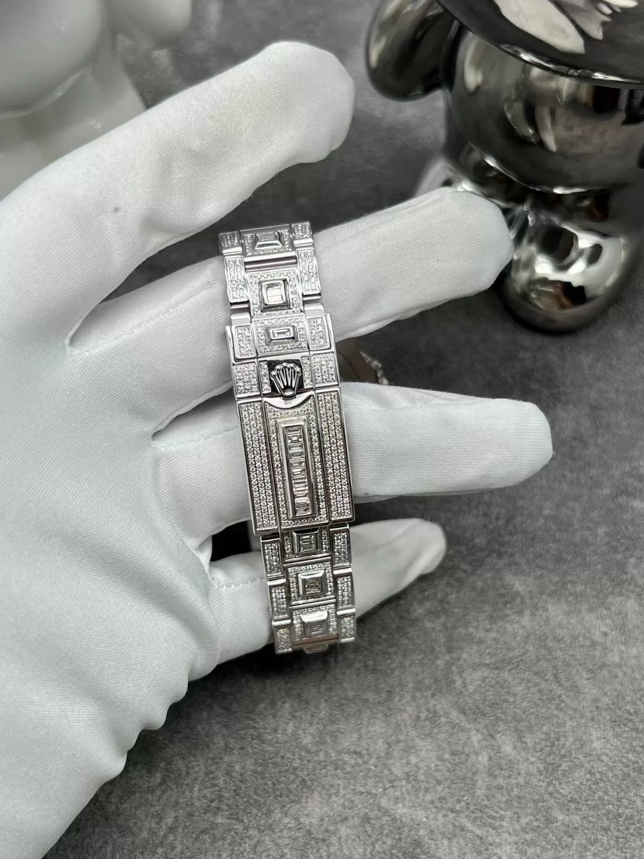 Dây đeo full kim cương với thiết kế ba mối nối vừa chắc chắn lại rất thời trang. Khóa gập tiện ích cùng biểu tượng vương miện của nhà Rolex giúp tăng khả năng nhận diện thương hiệu.