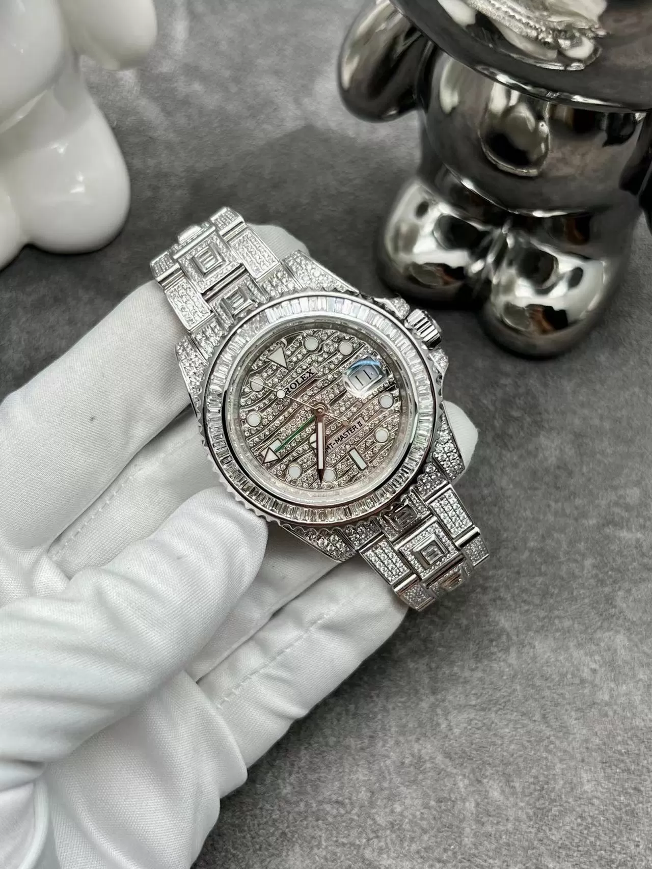 Miêu tả chi tiết đồng hồ Rolex GMT-Master II 116769tbr chế tác vàng khối 18k, full kim cương thiên nhiên