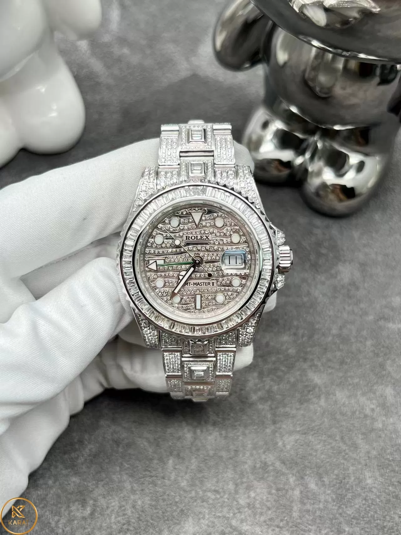 Nếu bạn không đủ tiền chinh phục các siêu phẩm đắt đỏ và khan hiếm của nhà Rolex thì phiên bản chế tác tại Karat hoàn toàn có thể thay thế. Đồng hồ Rolex GMT-Master II 116769tbr chế tác vàng khối 18k, full kim cương thiên nhiên là gợi ý hoàn hảo. Đeo model này lên tay bạn sẽ tự tin vì chuẩn đẳng cấp thượng lưu.
