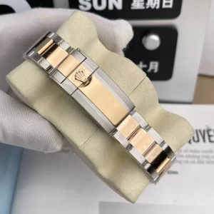 Dây đeo Oyster 3 mắt xích thép không gỉ demi rose gold, chải xước cạnh ngoài và đánh bóng trung tâm, mang lại cảm giác mịn màng thoải mái suốt ngày dài. Khóa gập Oysterlock với Easylink điều chỉnh 5mm tiện lợi, giúp dây đeo ôm sát cổ tay mà vẫn linh hoạt.