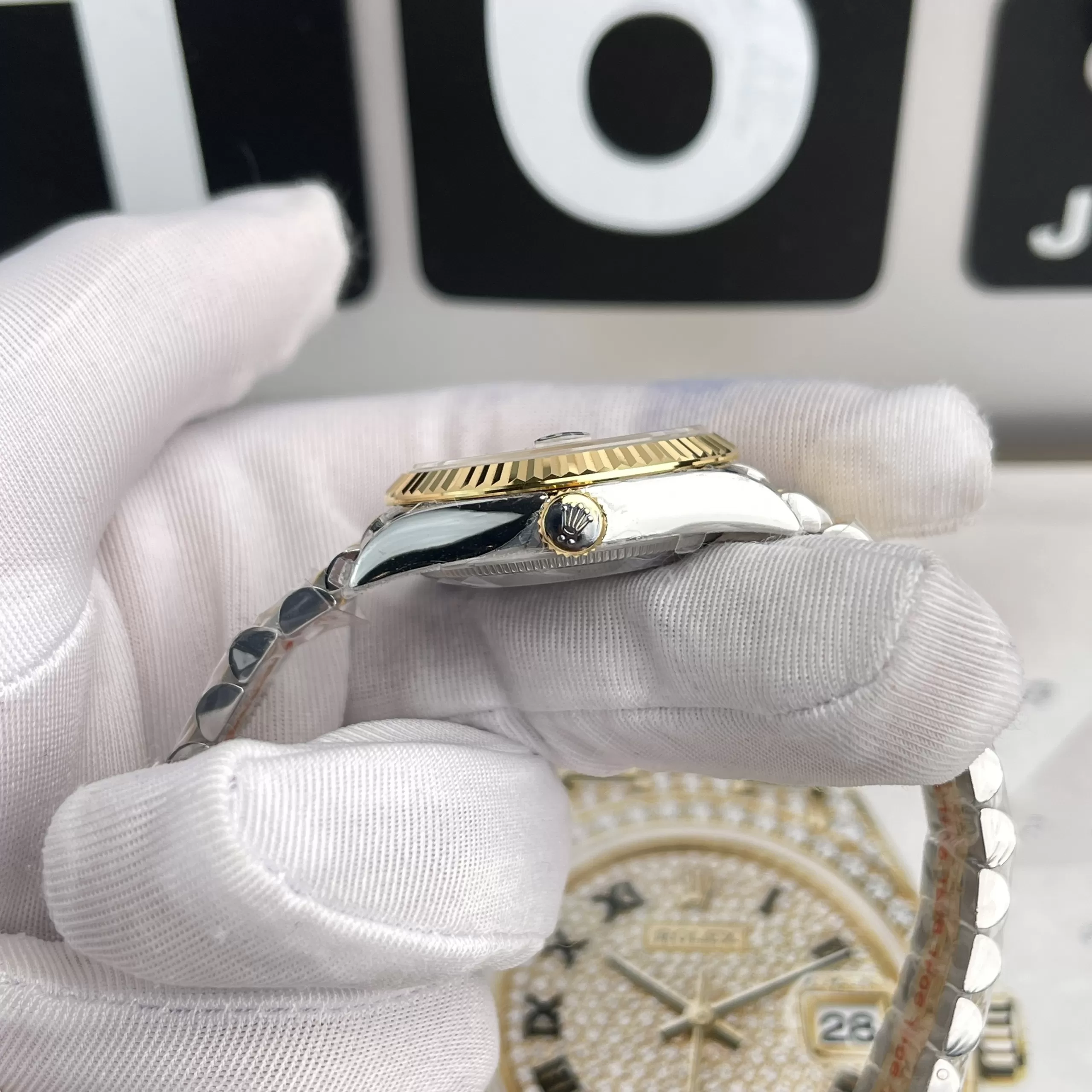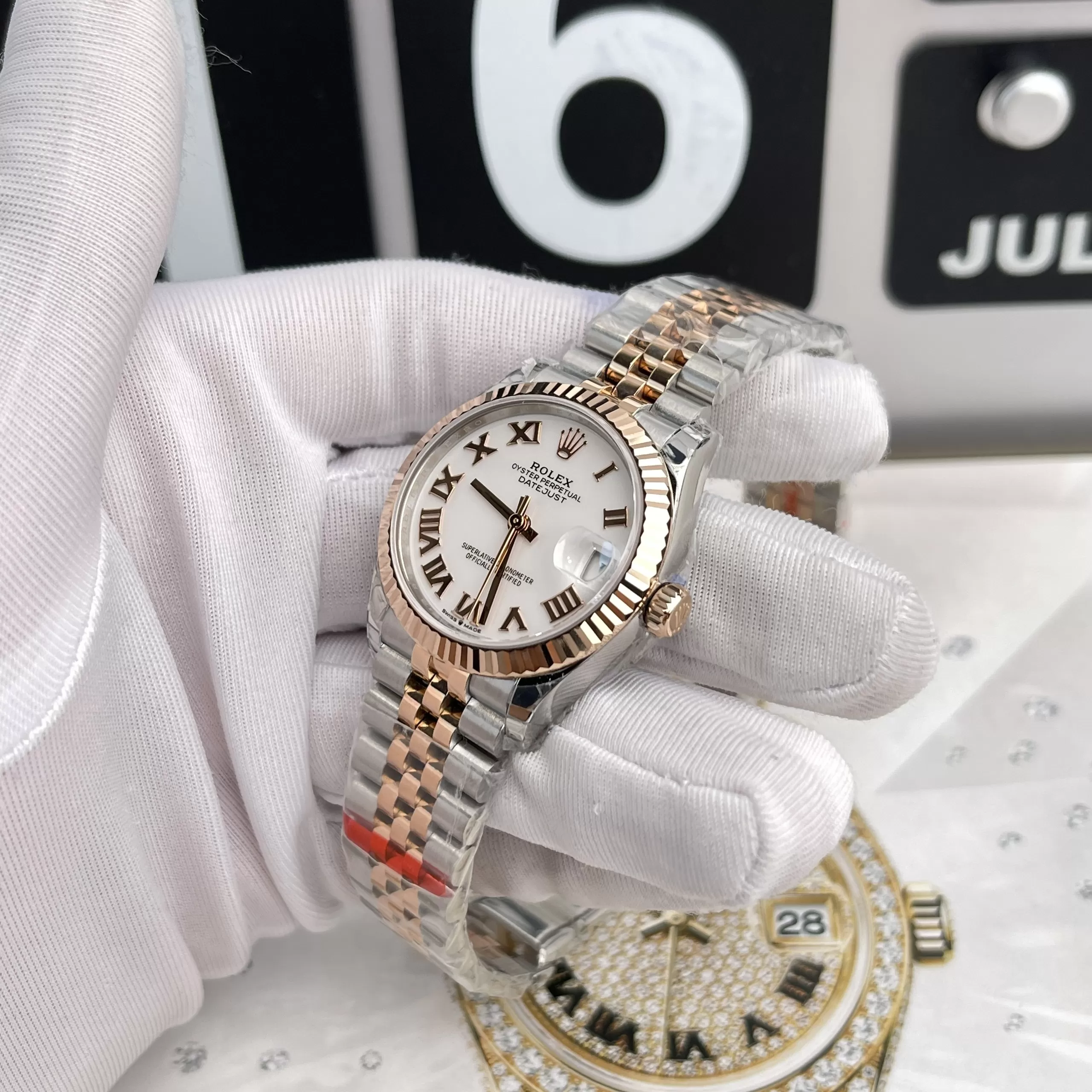 Trên nền mặt số màu trắng là bộ số La Mã kích thước lớn màu vàng hồng. Cửa sổ ngày có chức năng phóng to đặt gọn gàng ở vị trí 3h quen thuộc. Vị trí 12h là vương miện thương hiệu Rolex. Núm điều chỉnh nằm ở hông phải đồng hồ nên người dùng dễ dàng theo tác.