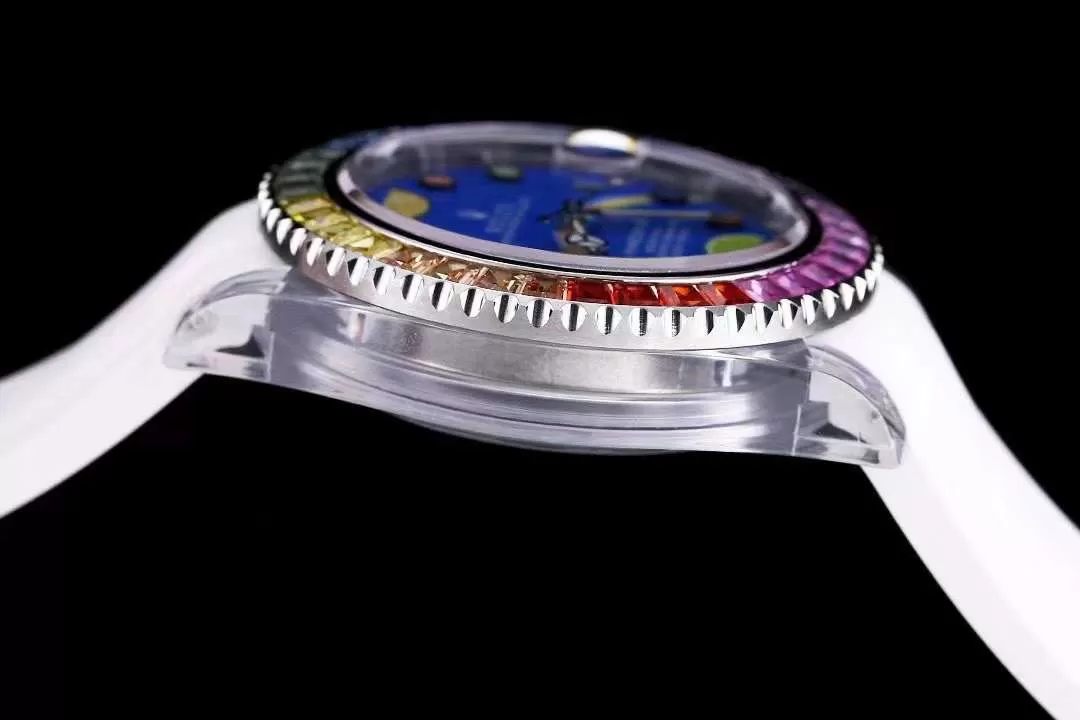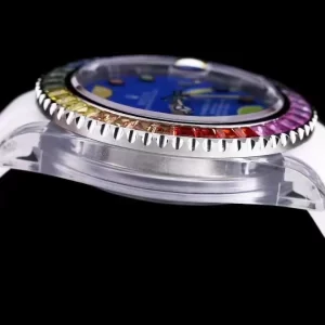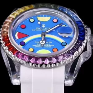 – Vành bezel nổi bật với thiết kế hình răng cưa tỉ mẫn. Bề mặt vành bezel là những viên đá saphire được sắp xếp theo bảy sắc cầu vồng tuyệt đẹp. Mặt số màu xanh nước biển dịu mát. Bộ cọc số đồng hồ Rolex Phantomlab Siêu Cấp có một không hai. Họa tiết hình chấm tròn, hình tam giác, hình trăng khuyết với nhiều màu sắc hiển thị rõ nét trên mặt số mang lại cho người dùng cảm giác vô cùng thú vị.