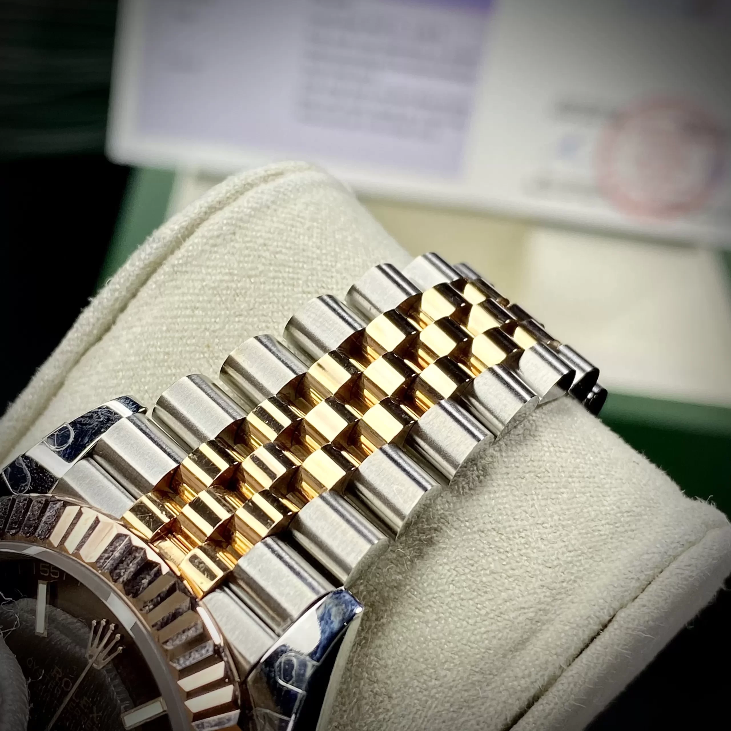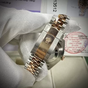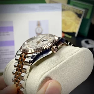 Dây đeo đồng hồ dạng Jubilee gồm 5 liên kết mang lại cho người dùng cảm giác chắc chắn, thoải mái, tiện ích. Dây phối màu vàng hồng – xám bạc thời thượng nổi bật trên cổ tay.