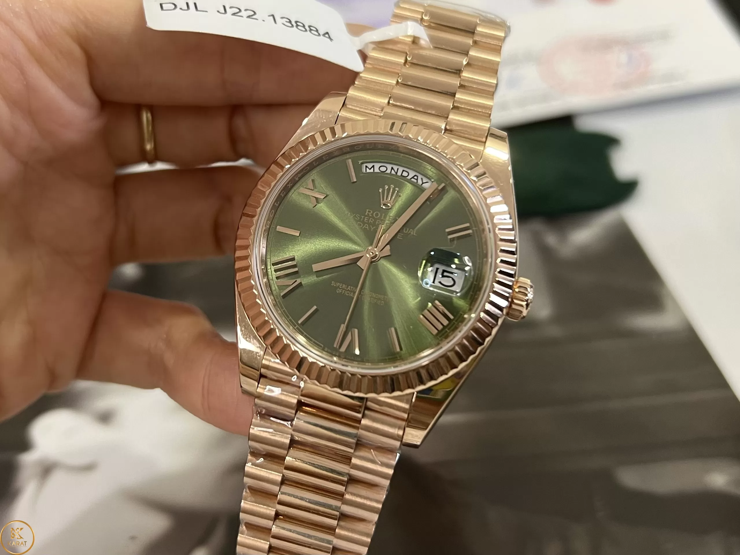 Tại vị trí 12h là cửa sổ thứ trong tuần. Cửa sổ ngày tại vị trí 3h có tính năng phóng đại giúp người dùng dễ dàng quan sát. Núm điều chỉnh hình bánh xe bên hông phải đồng hồ Rolex like auth Day-Date 40 228235-0025 vàng Everose nên thao tác nhanh và dễ.