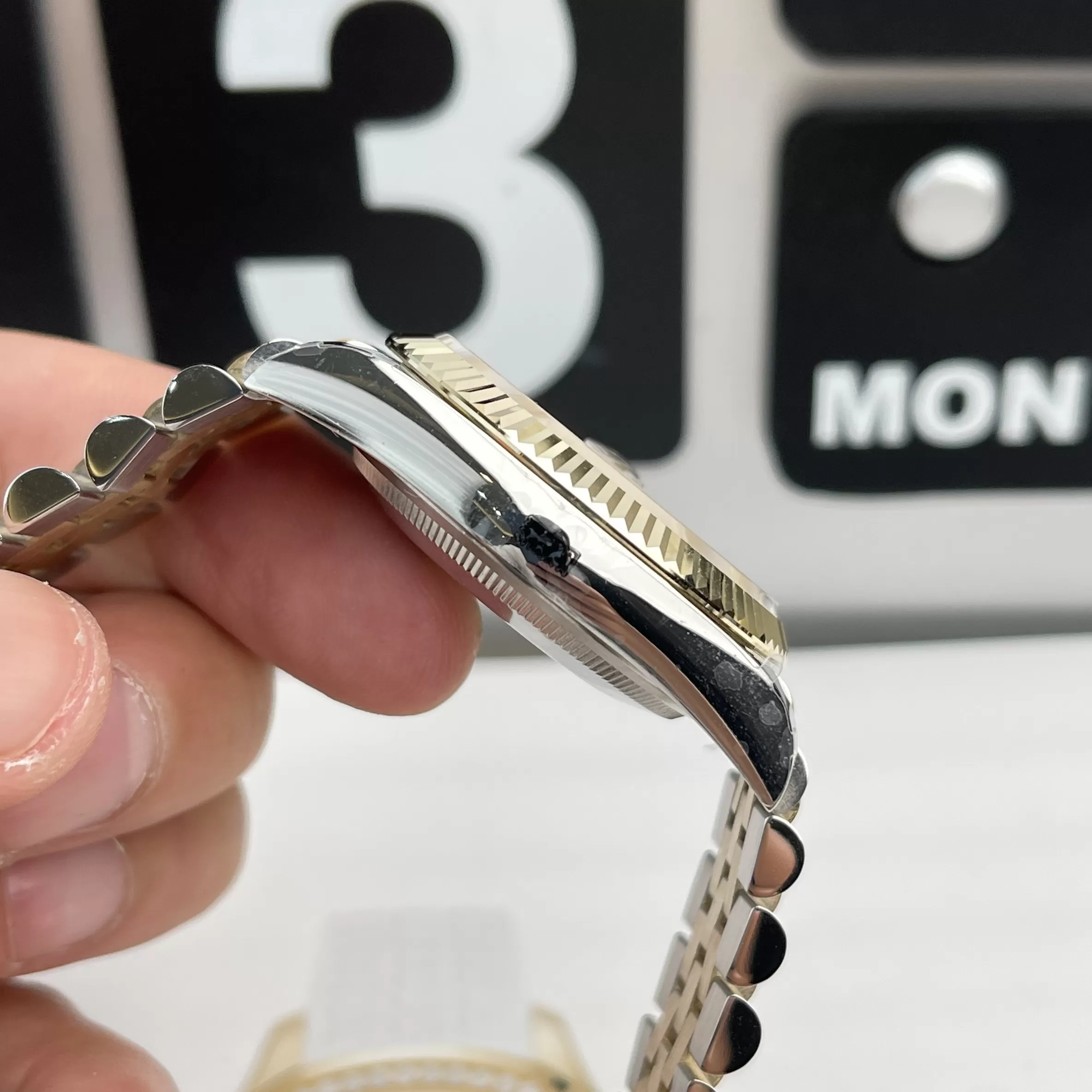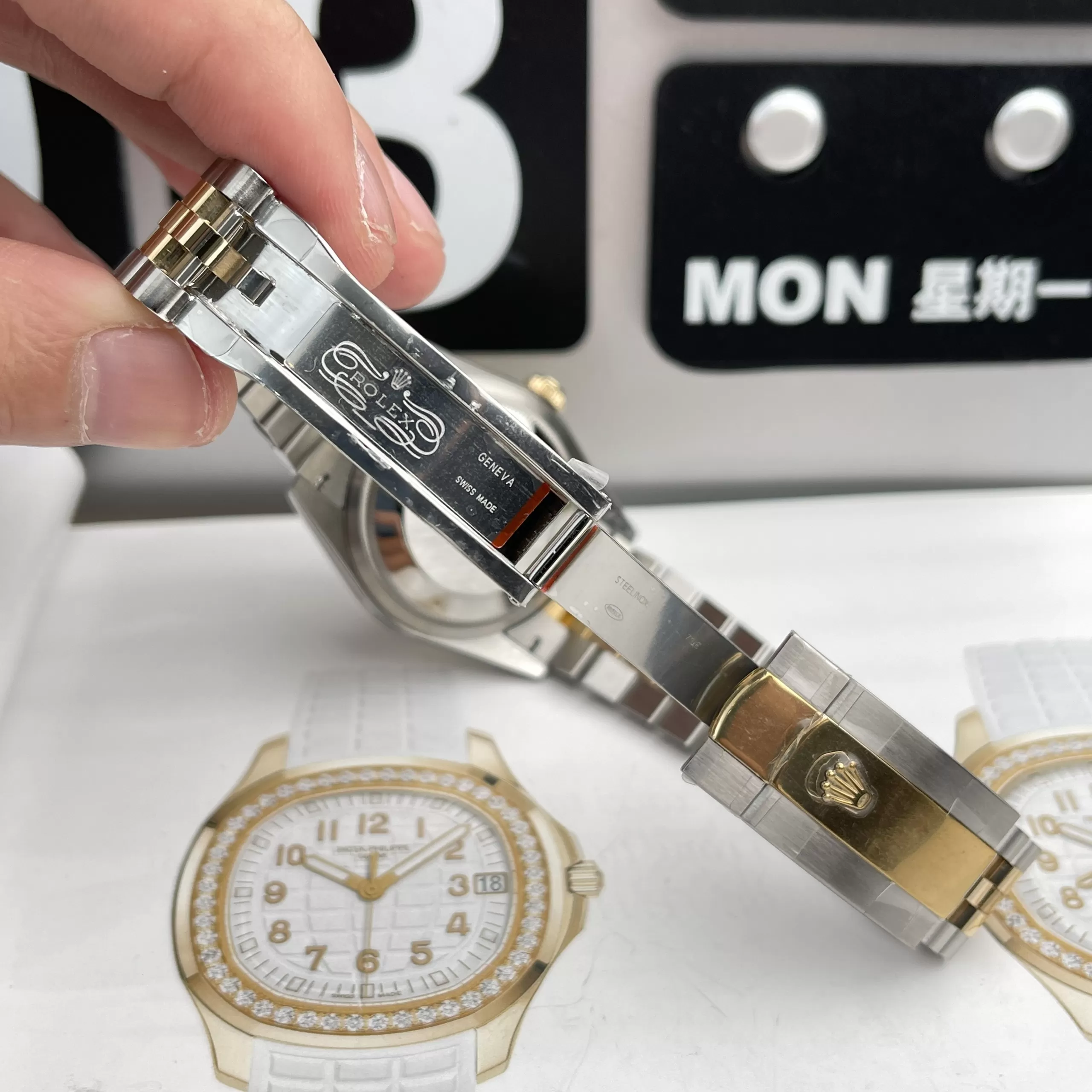 – Dây đeo đồng hồ Rolex Siêu Cấp chế tác từ thép hạng sang. Dây thiết kế 5 liên kết tinh tế với hai tông màu xám bạc, vàng. Dây đeo khóa gập tiện ích khắc biểu tượng thương hiệu rõ nét.