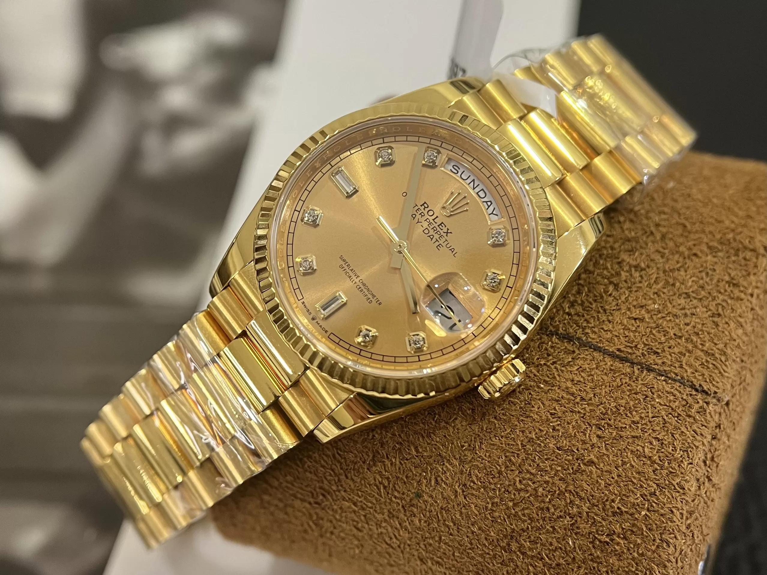 Chất lượng đồng hồ Rolex Super Fake 1:1 Day-Date 36 128238 Mặt Số Vàng Champagne Cọc Số Nạm Kim Cương đã được kiểm định. Hầu hết mọi tín đồ khi sở hữu model này đều phản hồi với mức độ hài lòng cao. Sản phẩm hiện có bán tại Karat với nhiều khuyến mãi hấp dẫn. Nếu bạn muốn kiểm chứng hãy gọi tới số hotline: 08333.99.666 nhé!
