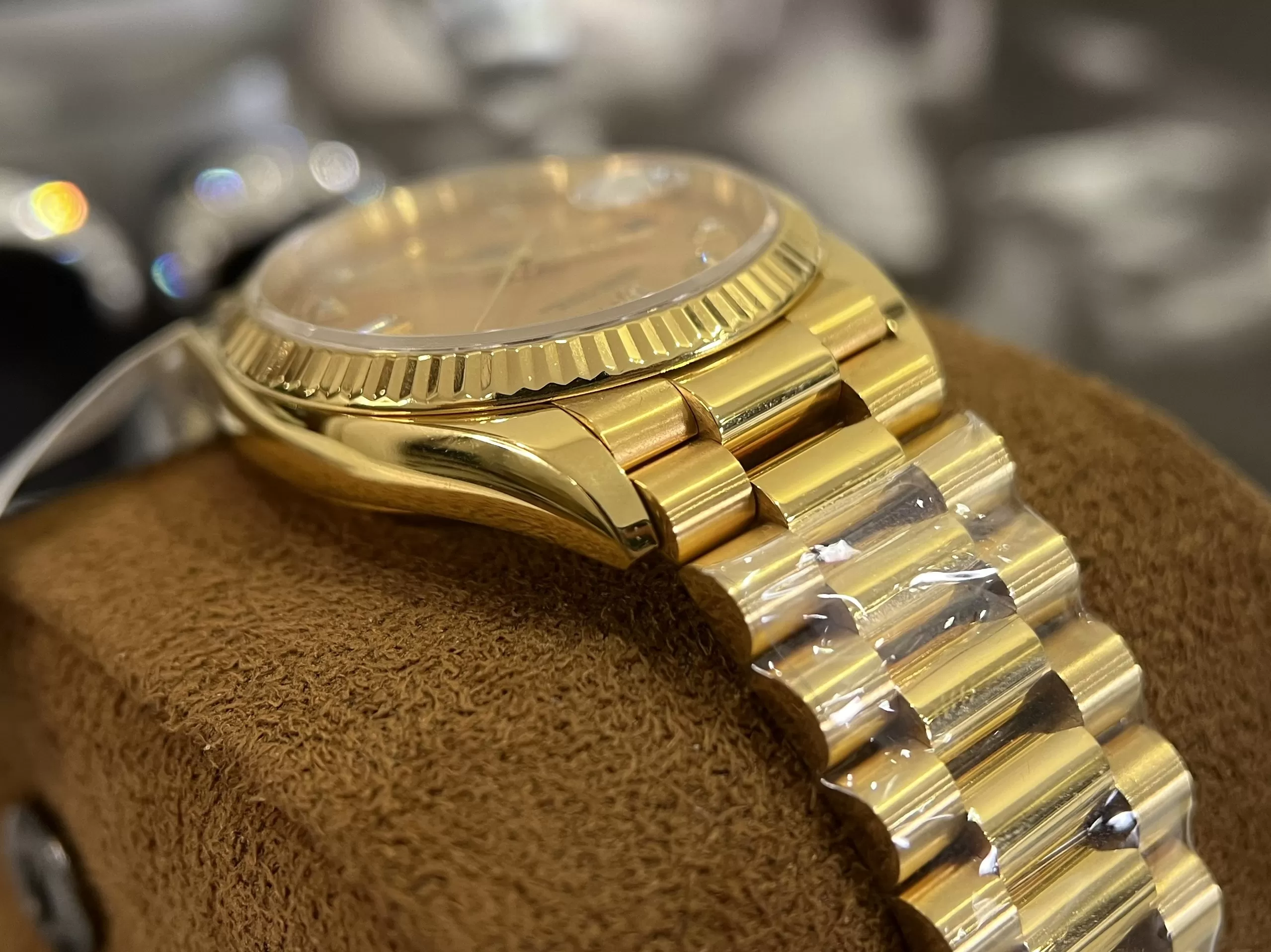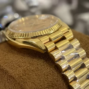 Vành bezel đồng hồ Rolex geneve fake Day-Date 36 128238 Mặt Số Vàng Champagne Cọc Số Nạm Kim Cương với những rãnh dập nổi nghệ thuật vừa có tính thẩm mỹ cao vừa tăng tính kháng nước cho đồng hồ.