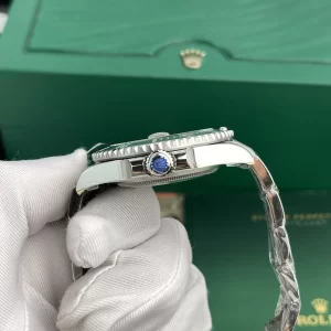 Núm vặn đồng hồ Rolex replica 1:1 Submariner 16610LV hình bánh xe có ốc vít chắc chắn. Nó có tính năng chống thấm, chống nước hoàn hảo cho phép người dùng an tâm khi đeo đồng hồ đi mưa, tắm gội hay rửa tay.