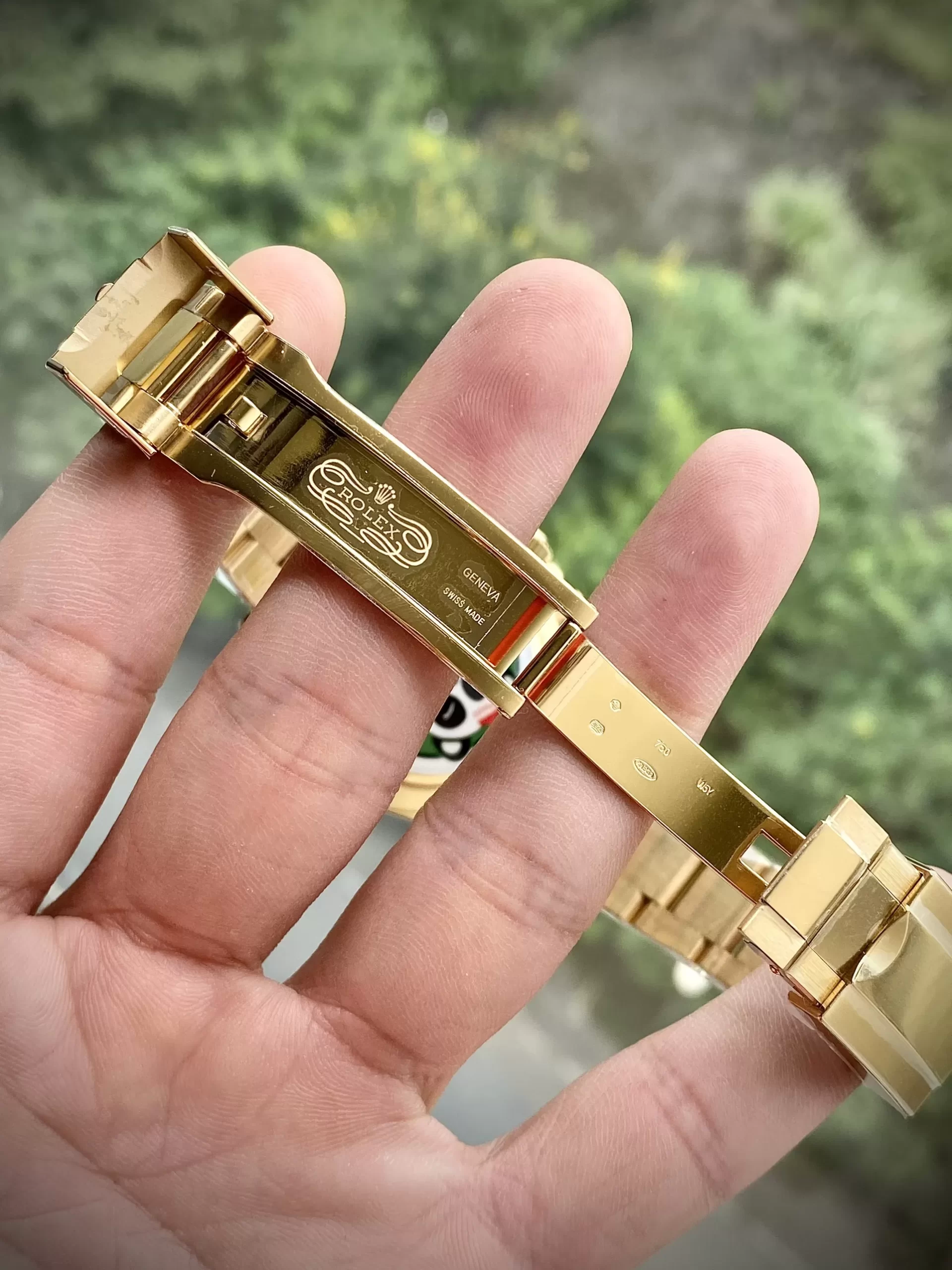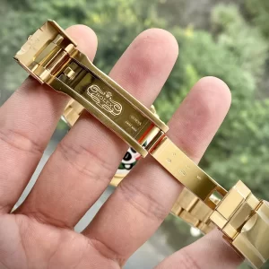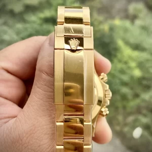 Dây đồng hồ Rolex geneve fake Cosmograph Daytona 116508 Mặt Số Vàng Champgne Đen bằng thép không gỉ mạ vàng sang trọng. Thiết kế dây 3 liên kết chắc chắn, lịch lãm. Khóa gập tiện ích được khắc logo Rolex giúp dễ dàng nhận diện thương hiệu. Ẩn dưới lớp vỏ chắc chắn là cỗ máy ETA chất lượng Thụy Sĩ. Cỗ máy này hoạt động bền bỉ, chuẩn xác, sai số có chăng chỉ từ 1 giây đến 3 giây/ngày. Máy automatic nên không phải thay pin, không phải lên cót mất thời gian.
