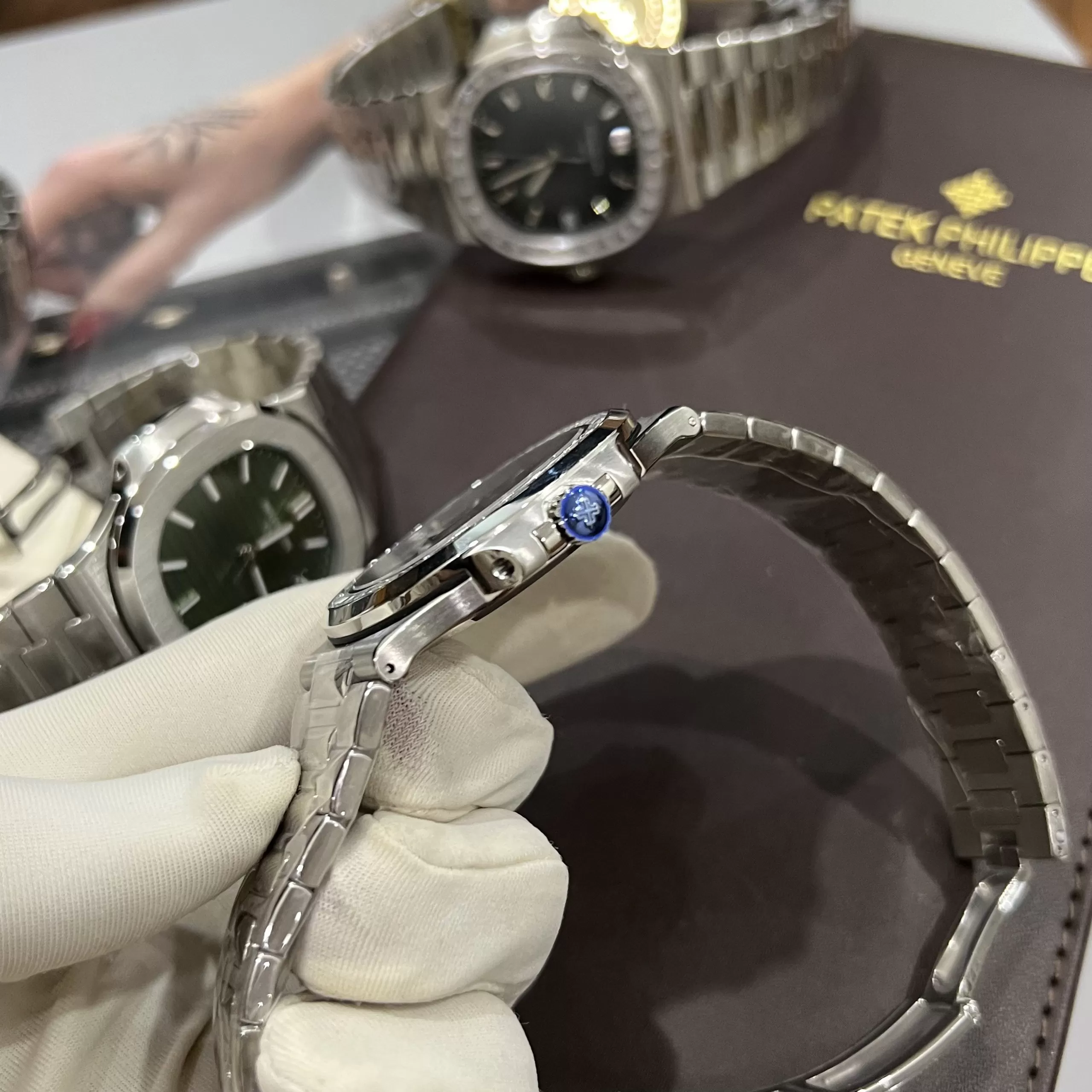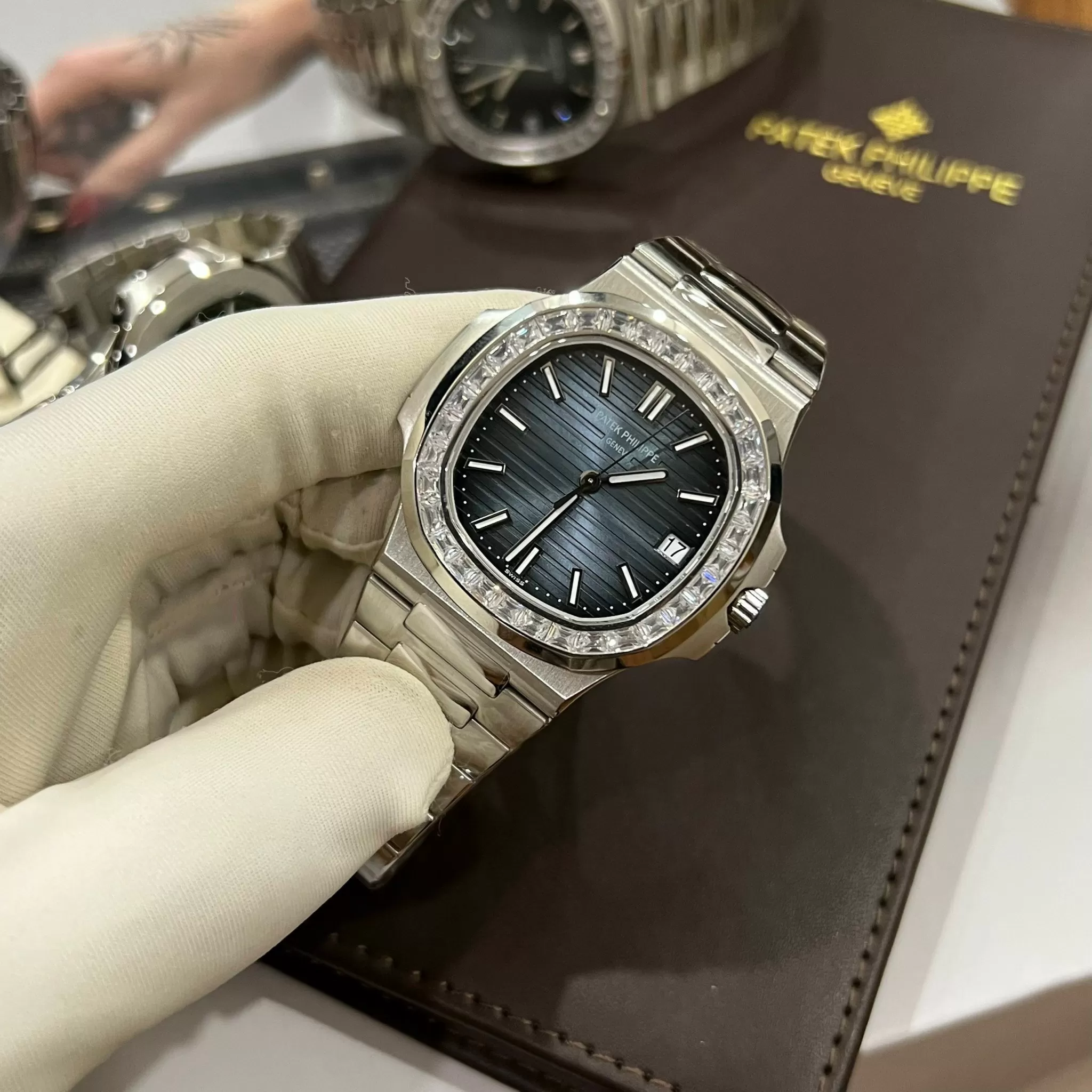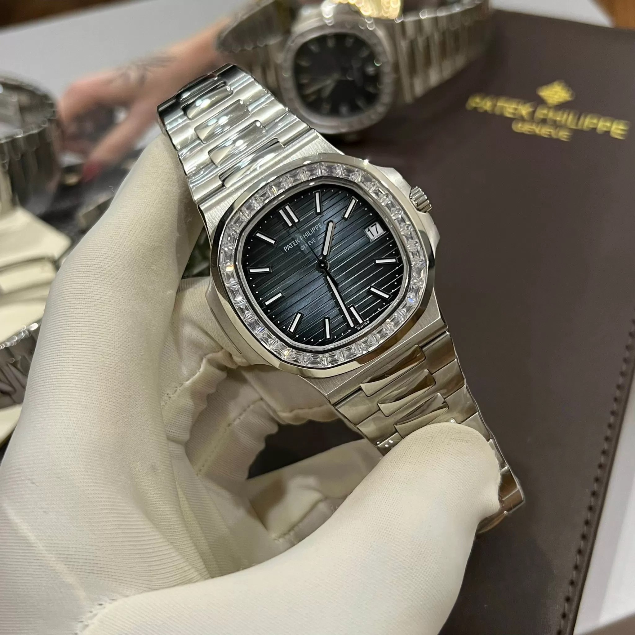 Đồng Hồ Siêu cấp 1:1 Patek Philippe Nautilus 5711/110P-001 Viền Kim Cương Moissanite