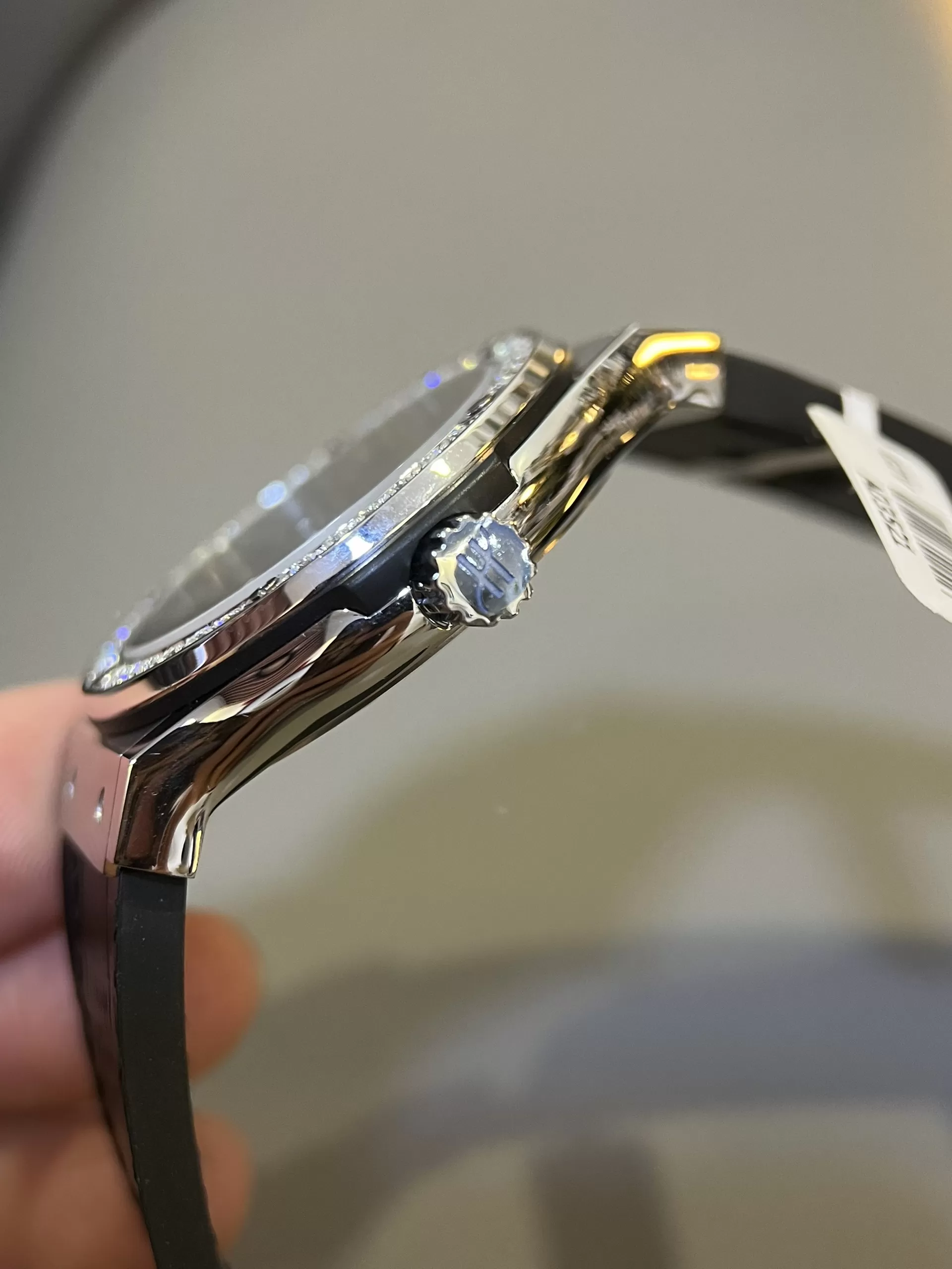Viên đá trắng lấp lánh trên vành bezel đồng hồ Hublot super fake