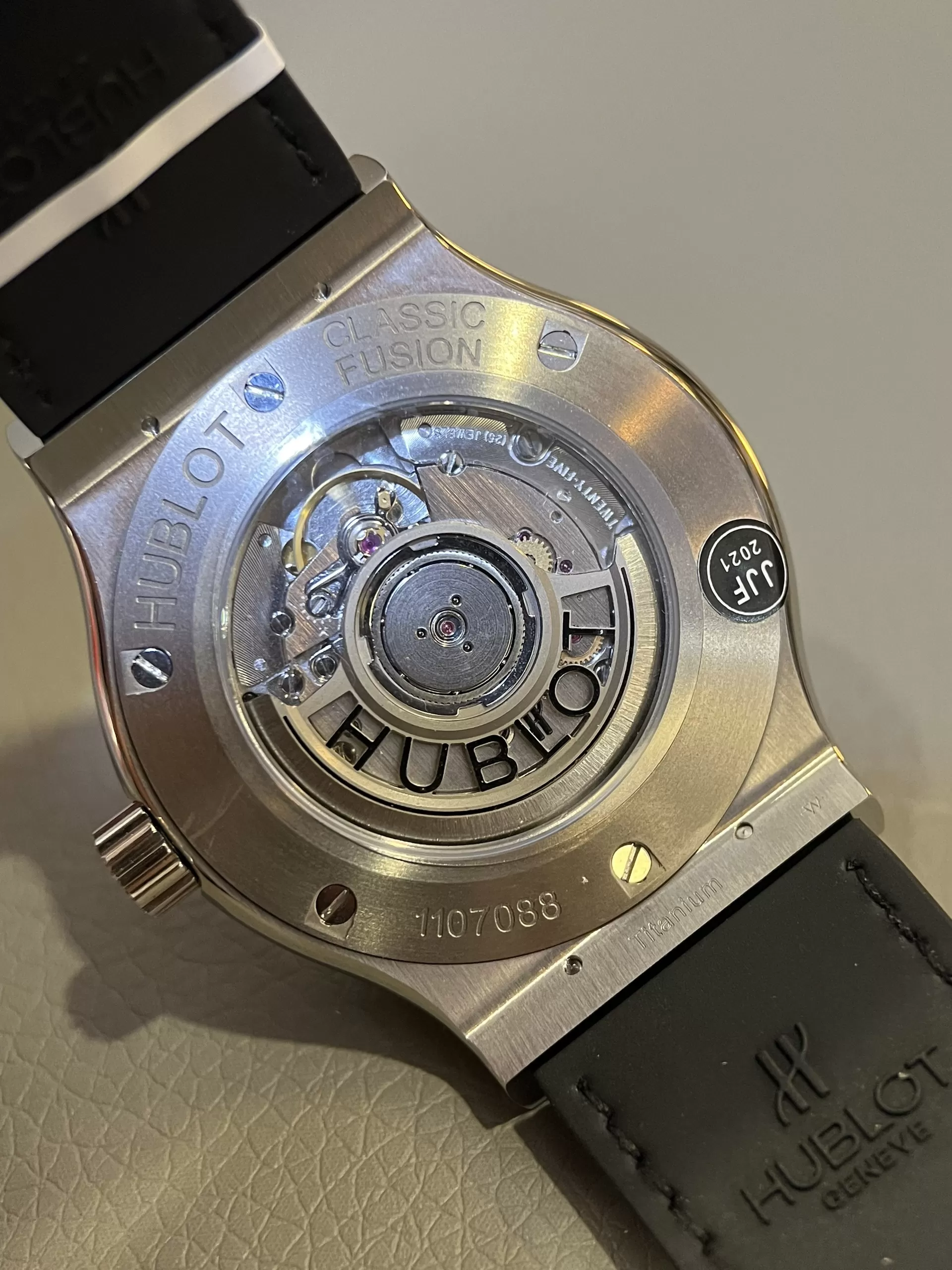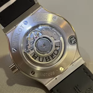 Đáy đồng hồ Hublot Classic Fusion Grey Titanium 42 mm fake 1:1 bằng Titanium nguyên khối. Dưới lớp kính shapphire được khắc chìm thông tin giới thiệu về sản phẩm. Bộ máy bên trong sử dụng Calibre HUB1110 cấu tạo bởi 21 chân kính, Automatic.