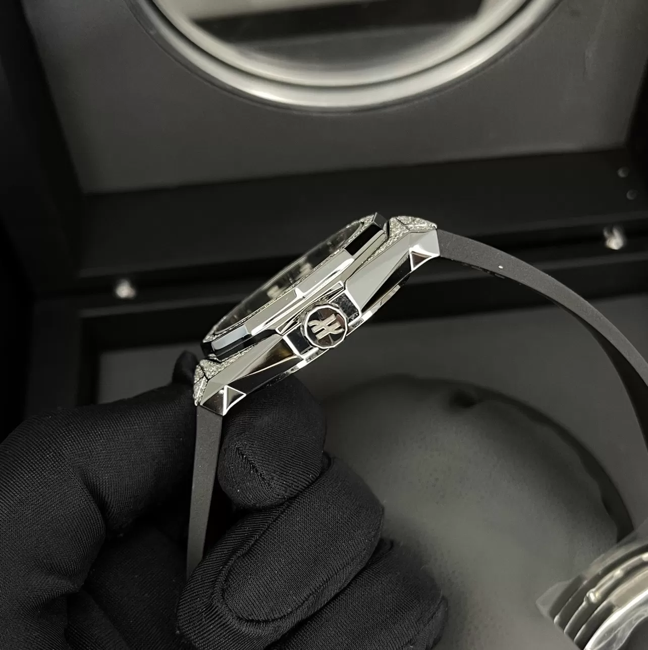 Bộ khung vỏ màu bạc sang trọng bằng chất liệu Titatinum cao cấp. Titanium độ cứng cao, chống xước tuyệt vời, chịu lực tốt, sáng bóng góp phần hoàn thiện sản phẩm. Vành bezel đính 54 viên kim cương thiên nhiên lấp lánh. Còn bộ vỏ nạm 210 viên kim cương. Tất cả bề mặt đều full kim cương, giúp đồng hồ khi đeo lên tay sáng rực, nổi bật.