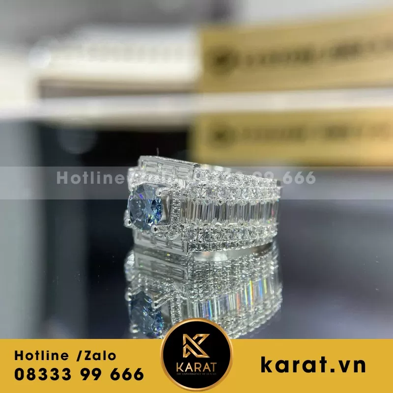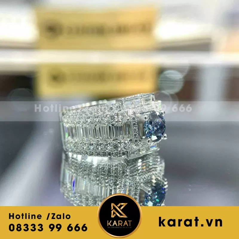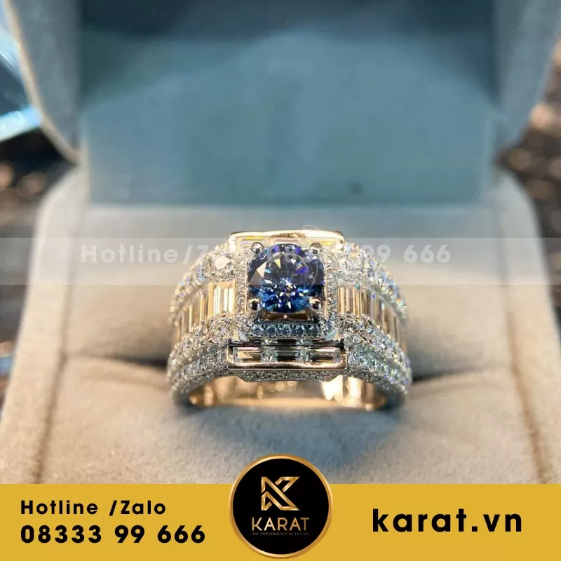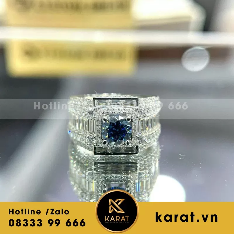 Nhẫn Nam Vàng Trắng 10K Viên Chủ Moissanite Xanh