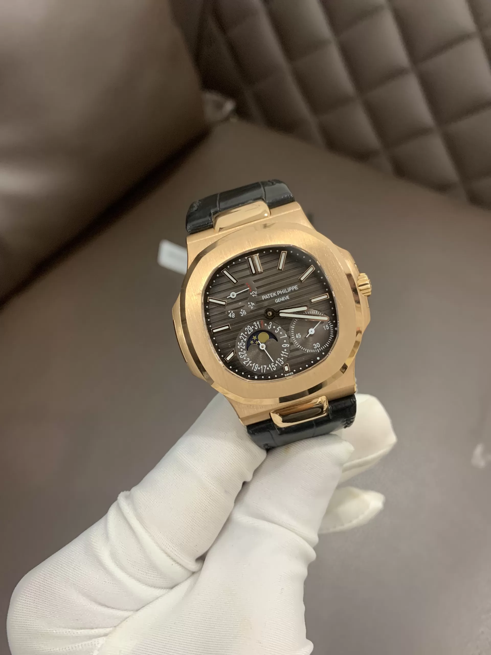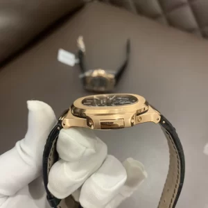 Đồng hồ PATEK PHILIPPE 5712 nổi bật như kiệt tác của dòng Nautilus, ra mắt năm 2006 với hình dáng porthole biểu tượng. Chế tác từ vàng hồng 18K, mẫu này kết hợp mặt số đen gradient và dây da đen cao cấp, phù hợp lối sống năng động mà vẫn toát lên đẳng cấp tinh tế.