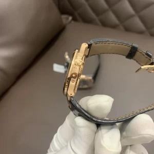 Dây da đen cao cấp, may tay chắc chắn, khóa gập vàng hồng ẩn an toàn. Thiết kế này mang lại sự thoải mái tối ưu, dễ thay đổi và phù hợp với trang phục đa dạng.