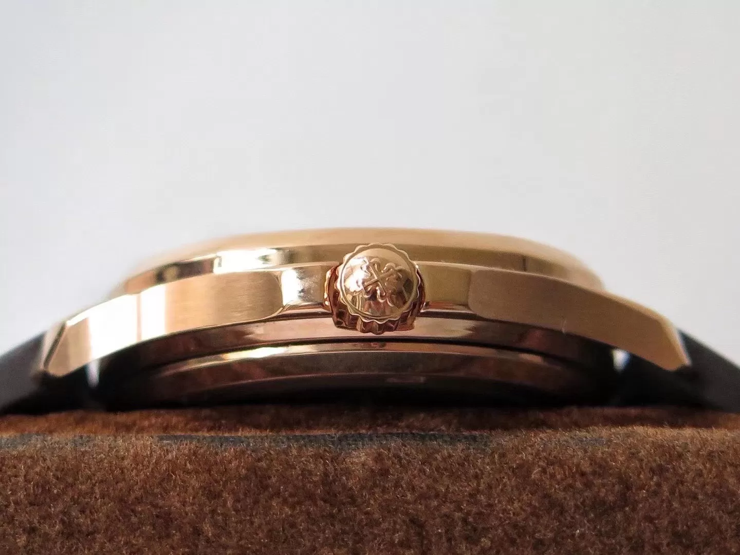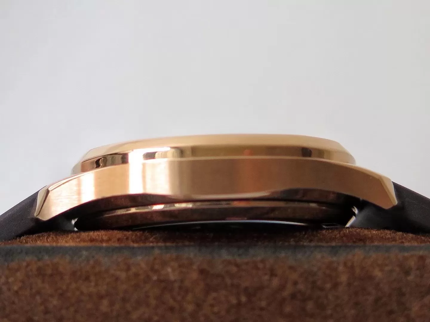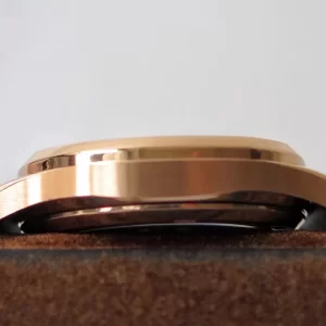 Vỏ rose gold 18K nguyên khối đường kính 34mm, dày 8.1mm mang độ mỏng nhẹ nhàng, bezel octagonal đính kim cương baguette tạo điểm nhấn rực rỡ, kính sapphire chống xước hiệu quả.