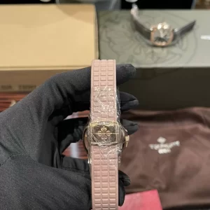 Bộ vỏ từ vàng hồng 18K chế tác tinh xảo, đường kính 38mm và dày 7.9mm, mang lại cảm giác mảnh mai nhưng vững chãi. Bezel octagonal đính kim cương baguette lấp lánh (~1.5ct), chống nước đến 120m nhờ crown vặn vít, vỏ được đánh bóng satin mịn, lý tưởng cho cổ tay nữ.