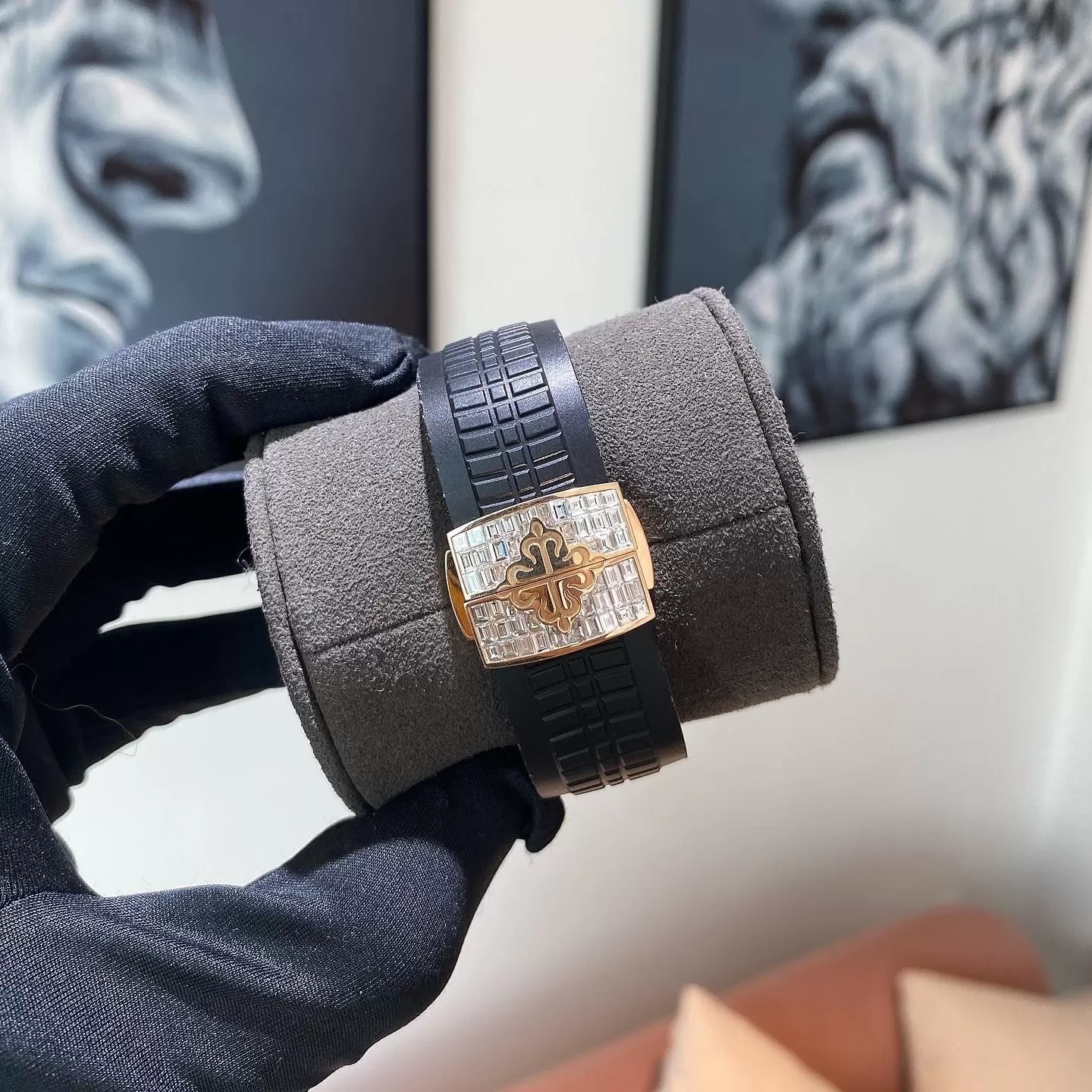 Bộ vỏ rose gold 18K đường kính 40mm chắc chắn, bezel đính 44 viên baguette diamonds (~7.4 ct) lấp lánh, mang độ bền vượt trội và vẻ ngoài tinh tế.