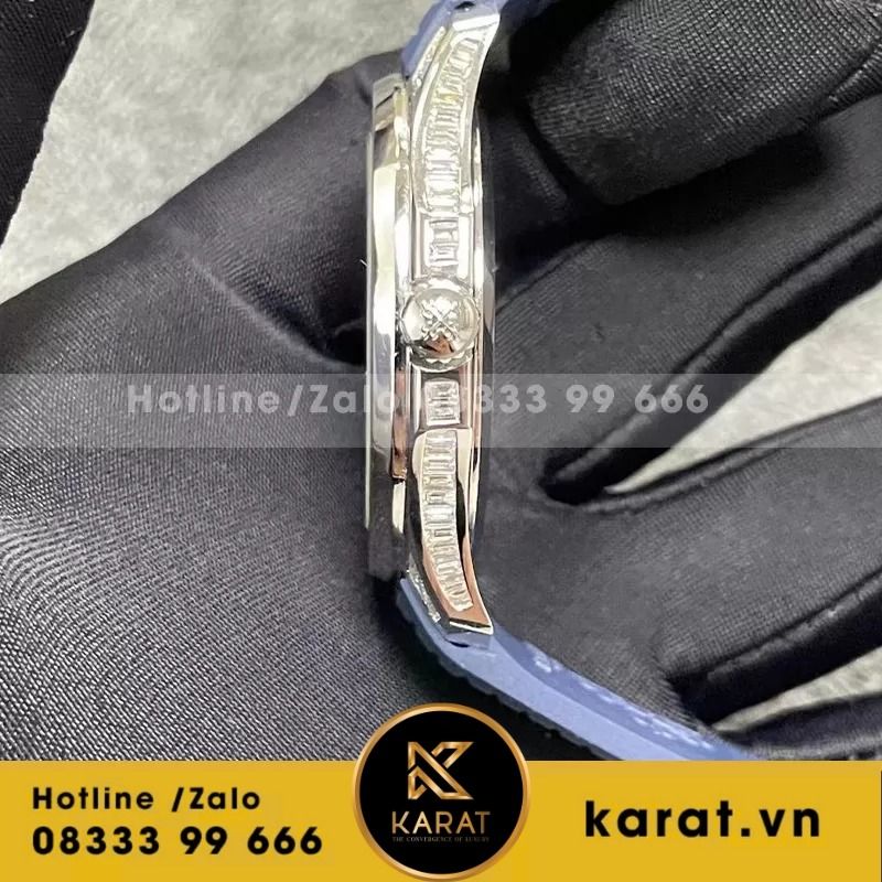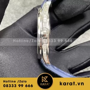 Đồng hồ Patek Philippe Aquanaut 5168 ra mắt năm 2019, kỷ niệm 20 năm dòng Aquanaut, với kích thước 42.2mm từ white gold cao cấp. Thiết kế tropical bezel đặc trưng kết hợp mặt số embossed xanh dương từ sáng đến tối, cùng 32 viên kim cương baguette trên bezel, tạo chiều sâu sang trọng. Sản phẩm này không chỉ chống nước tốt mà còn đại diện cho giá trị đầu tư lâu dài.