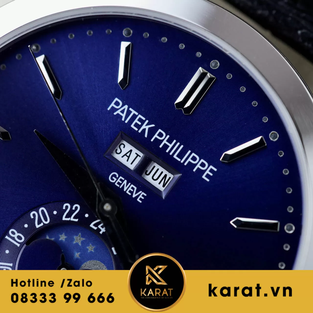 Mặt số gradient blue sunburst mịn màng, indices baguette diamonds dễ đọc, subdial moonphase tại 6 giờ và cửa sổ ngày-tháng, tạo chiều sâu huyền bí.