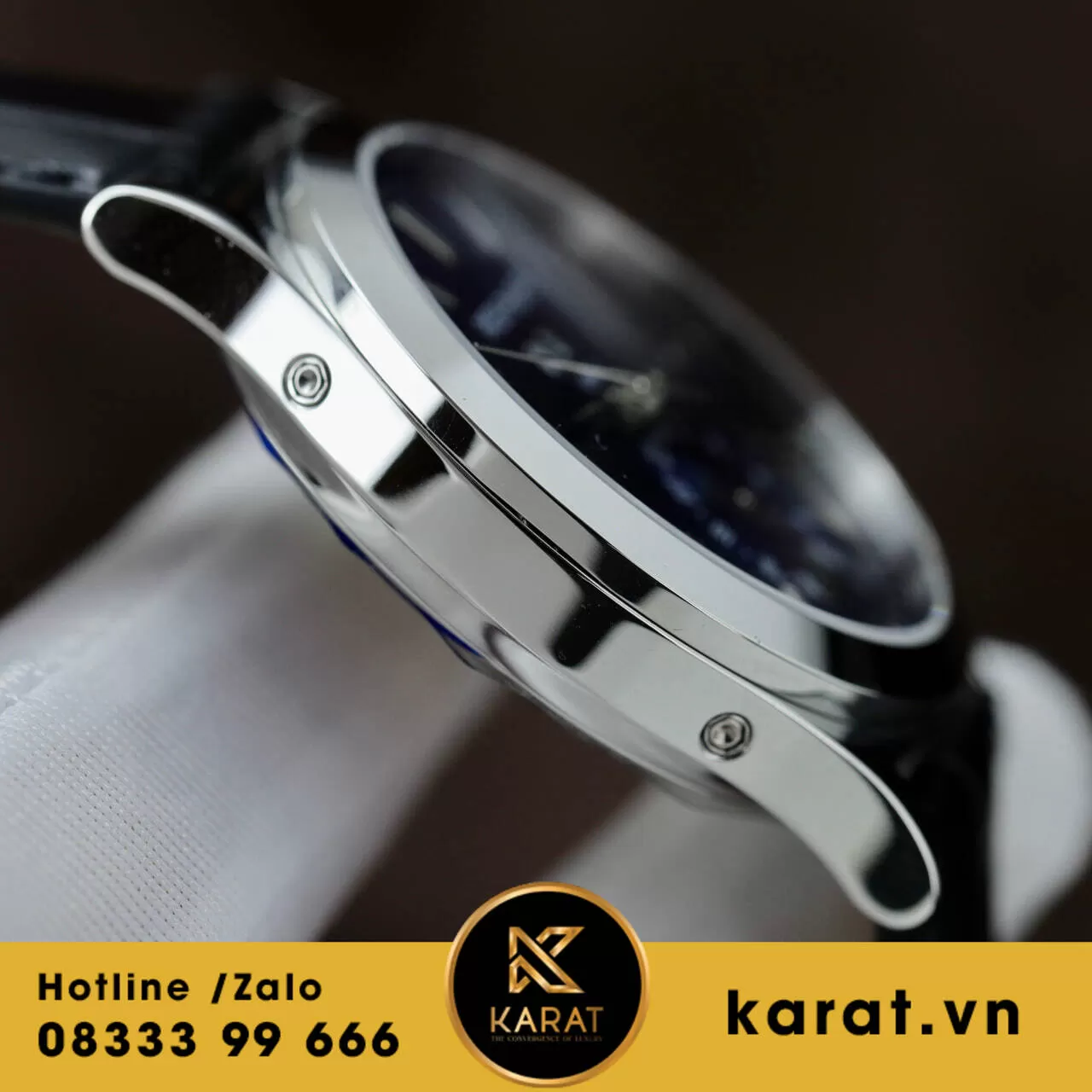 Dây da cá sấu navy blue bóng bẩy mềm mại, khóa gập white gold an toàn, ôm sát cổ tay thoải mái cho sử dụng hàng ngày.