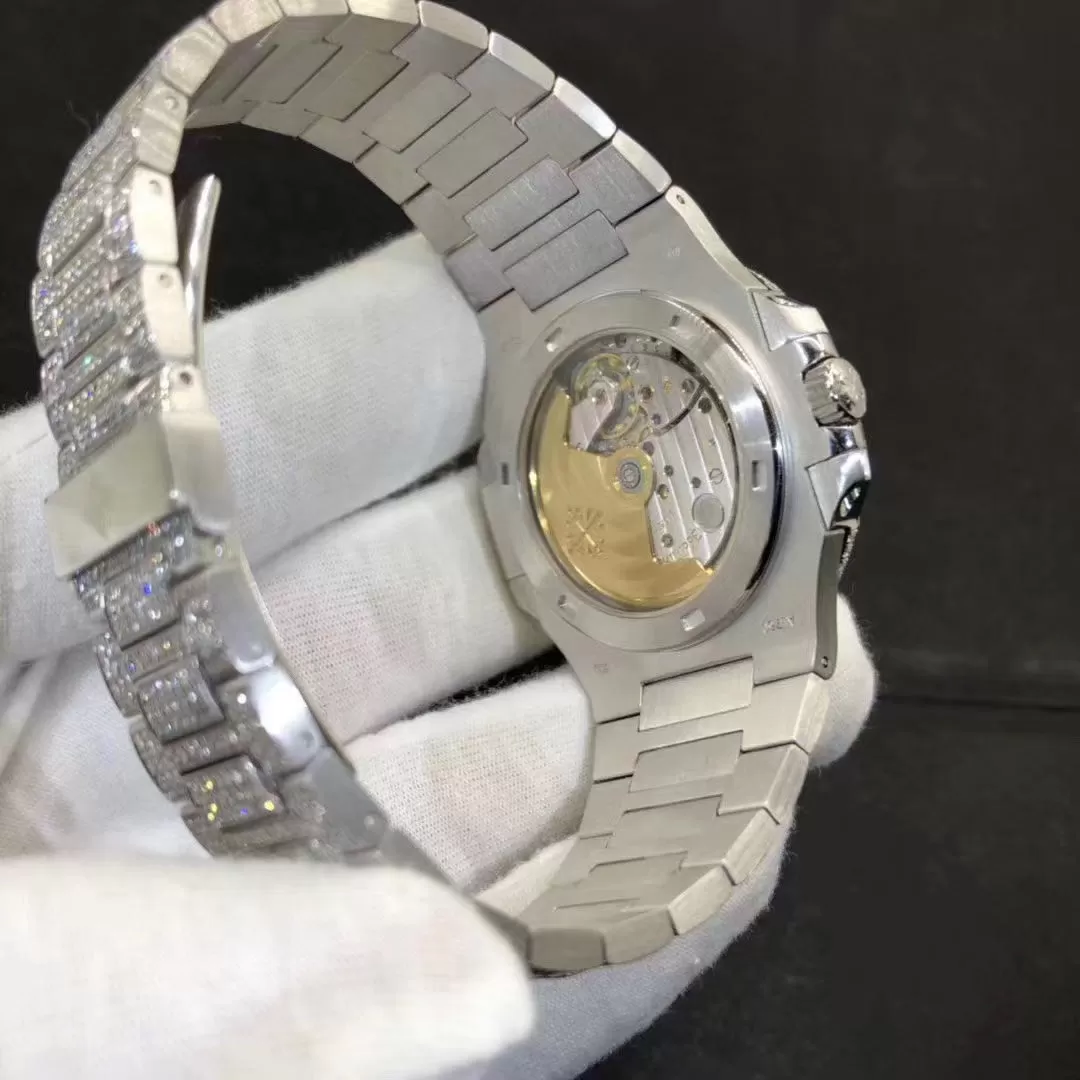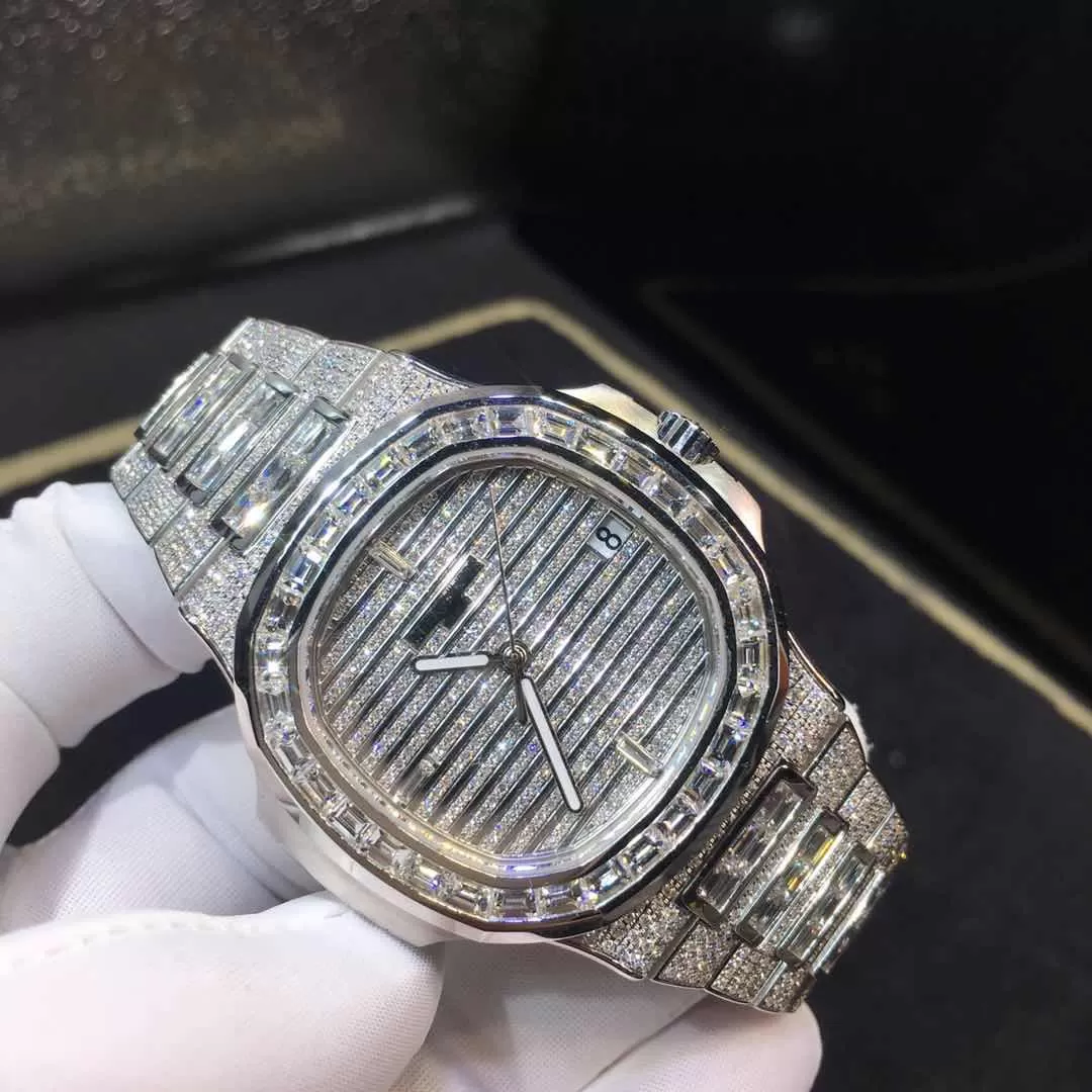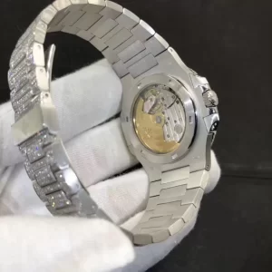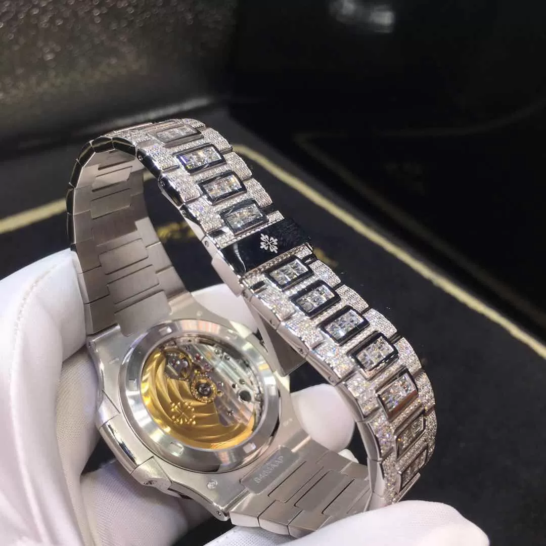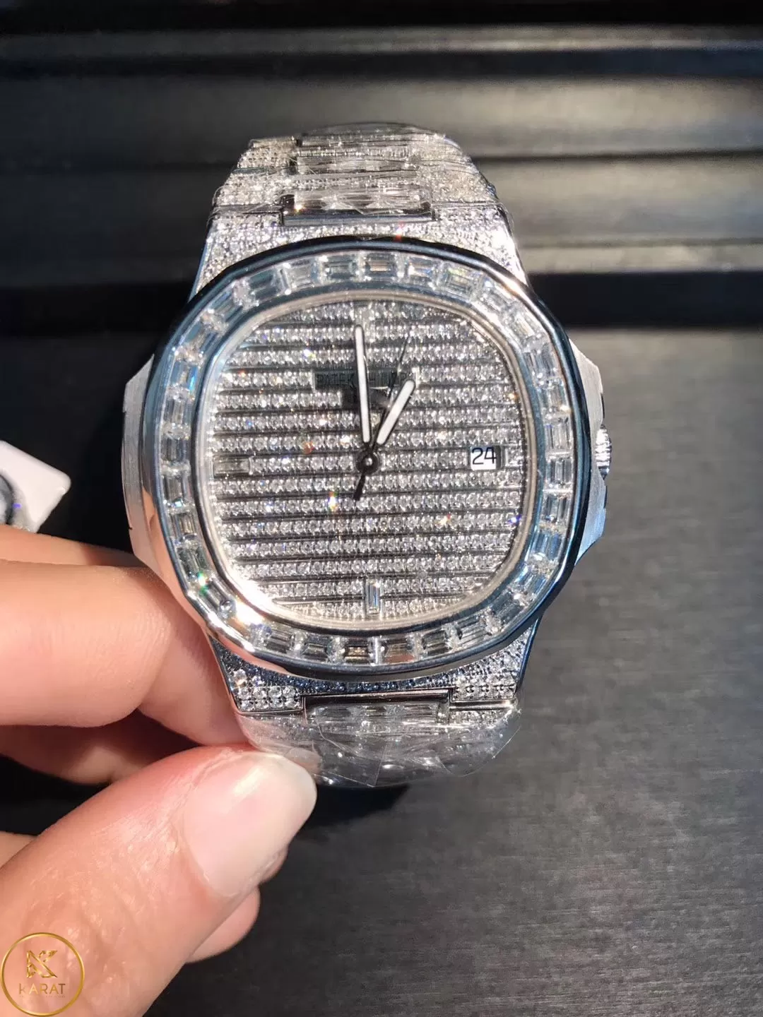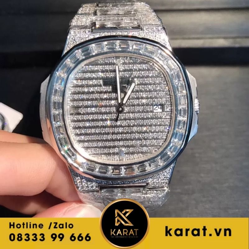Đồng hồ Patek Philippe rep 1.1 có thiết kế mặt số bạc trắng kim cương, khảm 255 viên tròn (1.36 carat), 3 chỉ giờ baguette. Kim giờ/phút mảnh mai, cửa sổ ngày tại vị trí 3 giờ, tạo sự hài hòa giữa đơn giản và xa hoa.