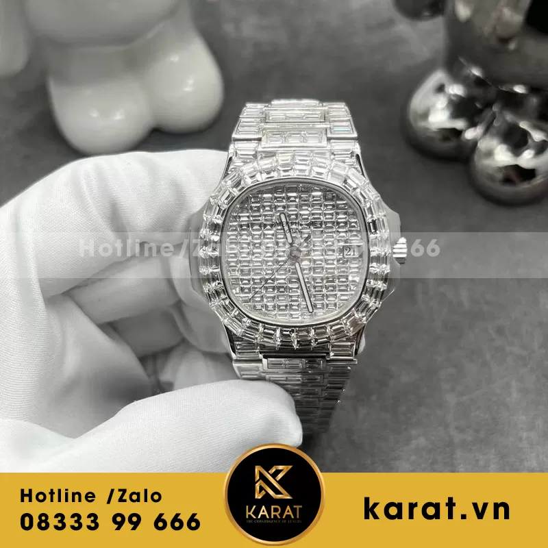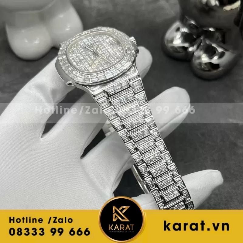 Vỏ 40mm được chế tác từ baguette diamond cao cấp, các đường nét tinh xảo tạo vẻ sang trọng, lấp lánh ở mọi góc nhìn, giữ được sự thanh lịch và cân đối đặc trưng của Nautilus.
