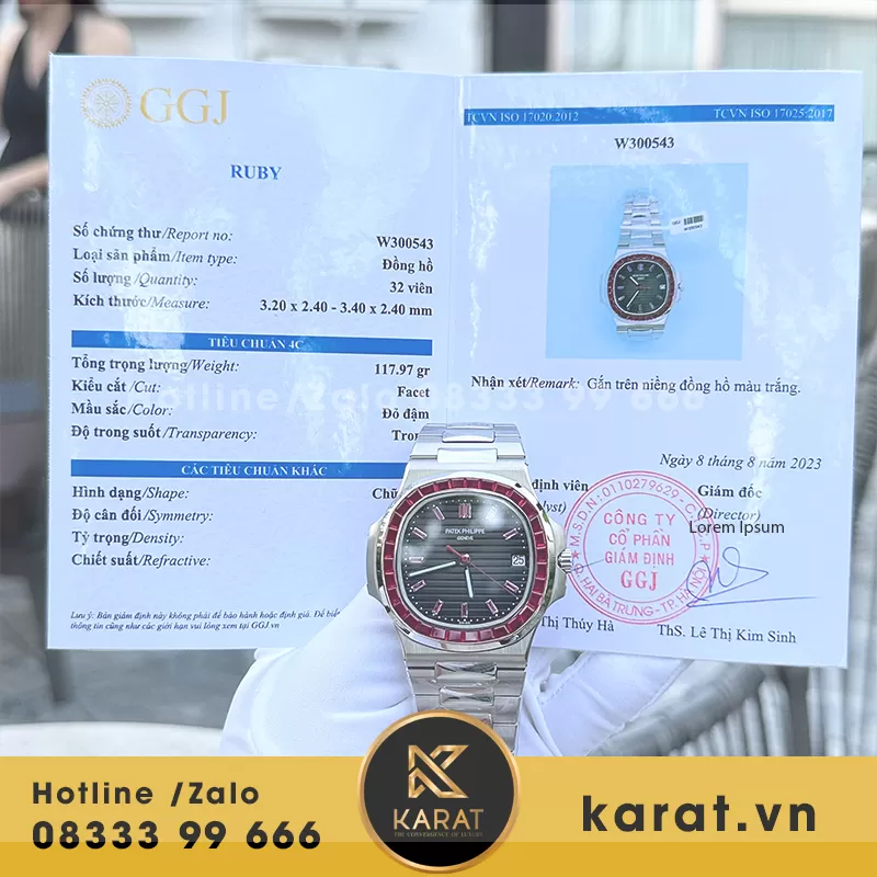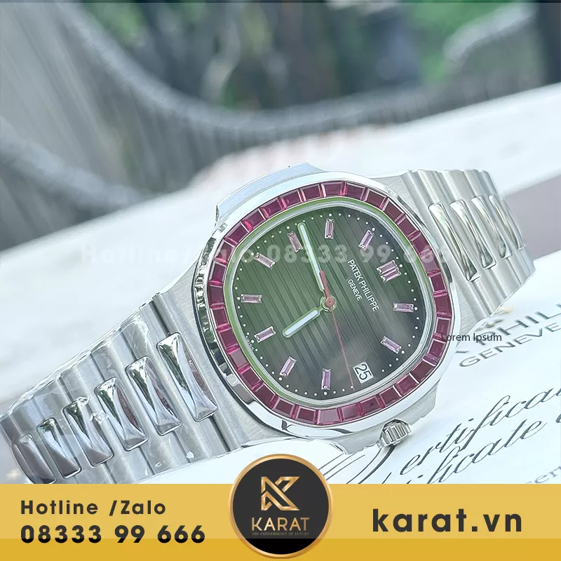 Karat.vn chuyên chế tác và phân phối đồng hồ Patek Philippe Nautilus 5723 ruby tổng hợp dial chất lượng, kèm bảo hành toàn diện cùng tư vấn chuyên nghiệp. Khách hàng dễ dàng mua qua website hoặc showroom với hộp đựng đầy đủ.