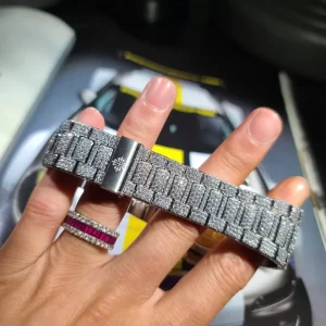 Dây đeo vàng trắng 18k mắt xích Nautilus linh hoạt, khảm kim cương thiên nhiên đồng điệu. Thiết kế ôm sát cổ tay 14-18cm, mang lại sự thoải mái suốt ngày dài.