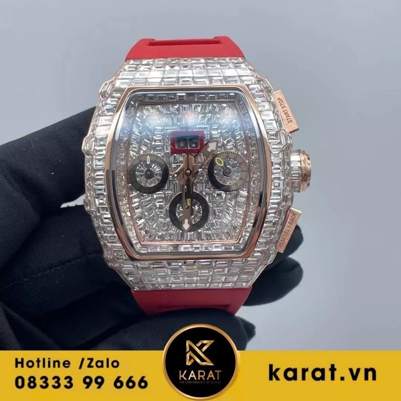 Karat.vn cung cấp Đồng hồ Richard Mille RM11-03 chế tác vàng hồng 18k đính kim cương baguette với độ hoàn thiện chuẩn 99%, kèm hộp sổ, giấy kiểm định DOJI và GIV. Ngoài ra, Karat hỗ trợ spa, lau dầu, và thu đổi sản phẩm giá tốt.